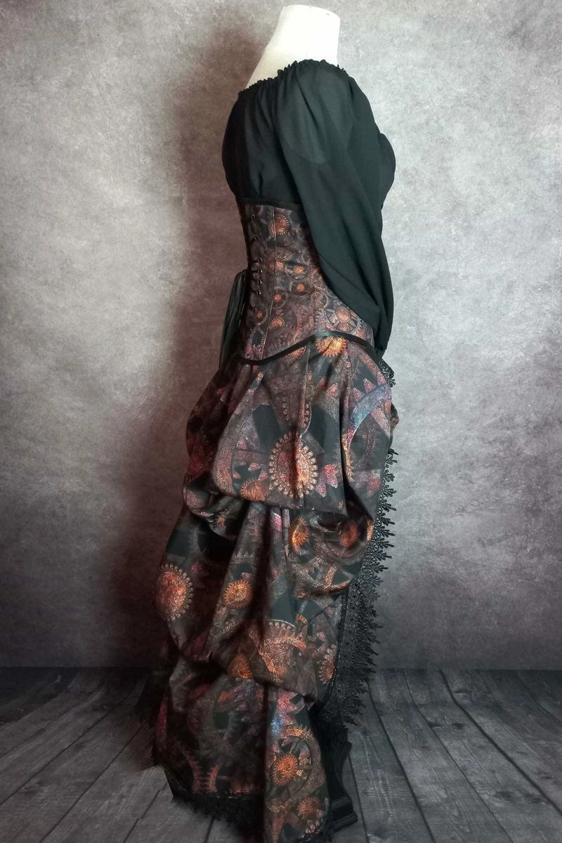 Unique Gallery Serpentine victorian bustle skirt in a fun steampunk fabric with a matching under bust corset.