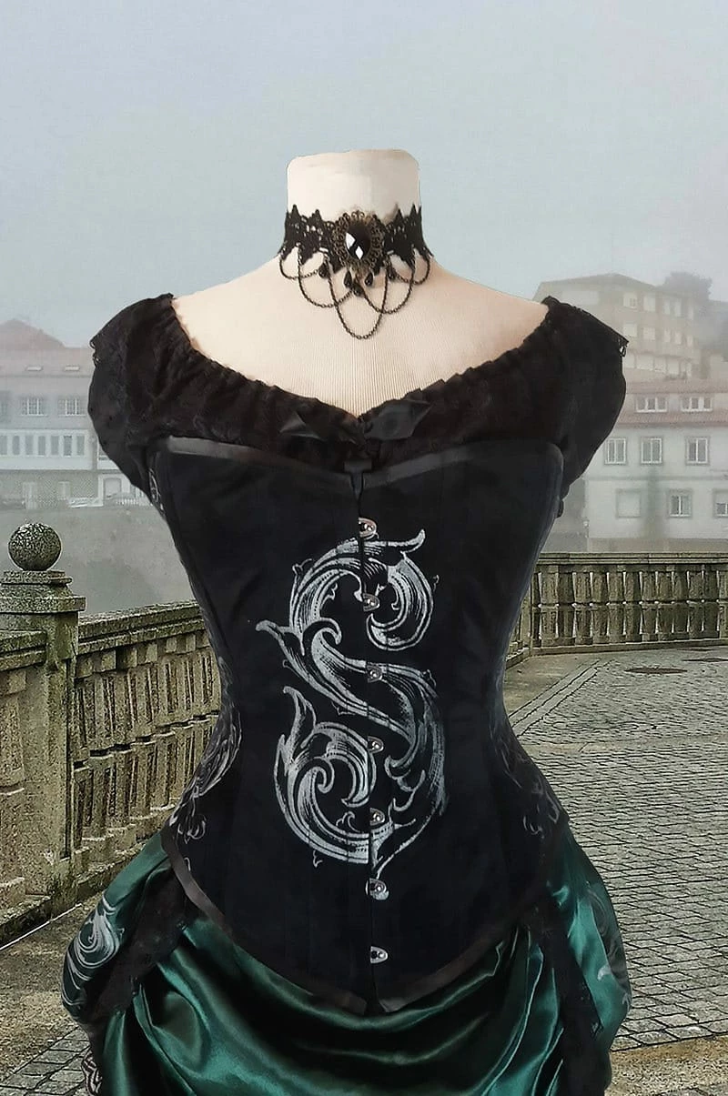 The Potion Mistress is a sleek black velvet over bust corset, made here in Australia & hand screen printed with our favourite scrolls print, in silver. Designed with Potion Mistresses in mind (you know who you are!)