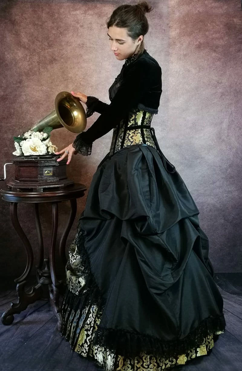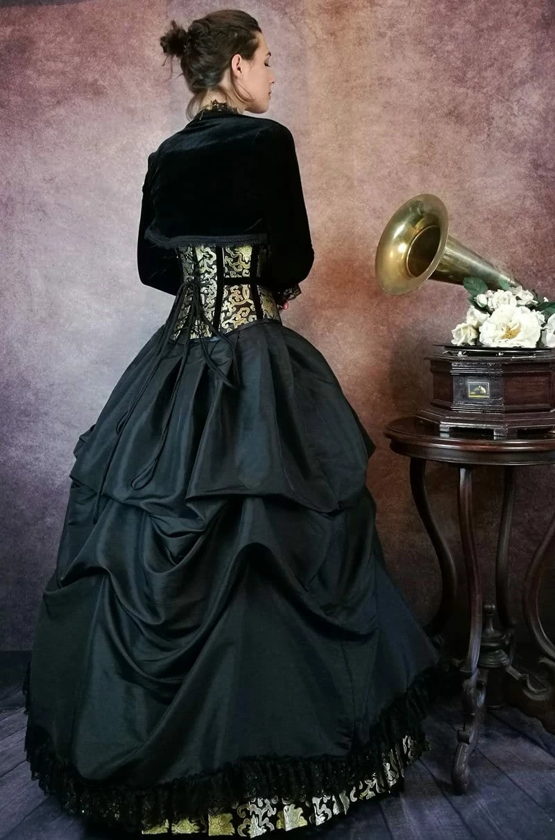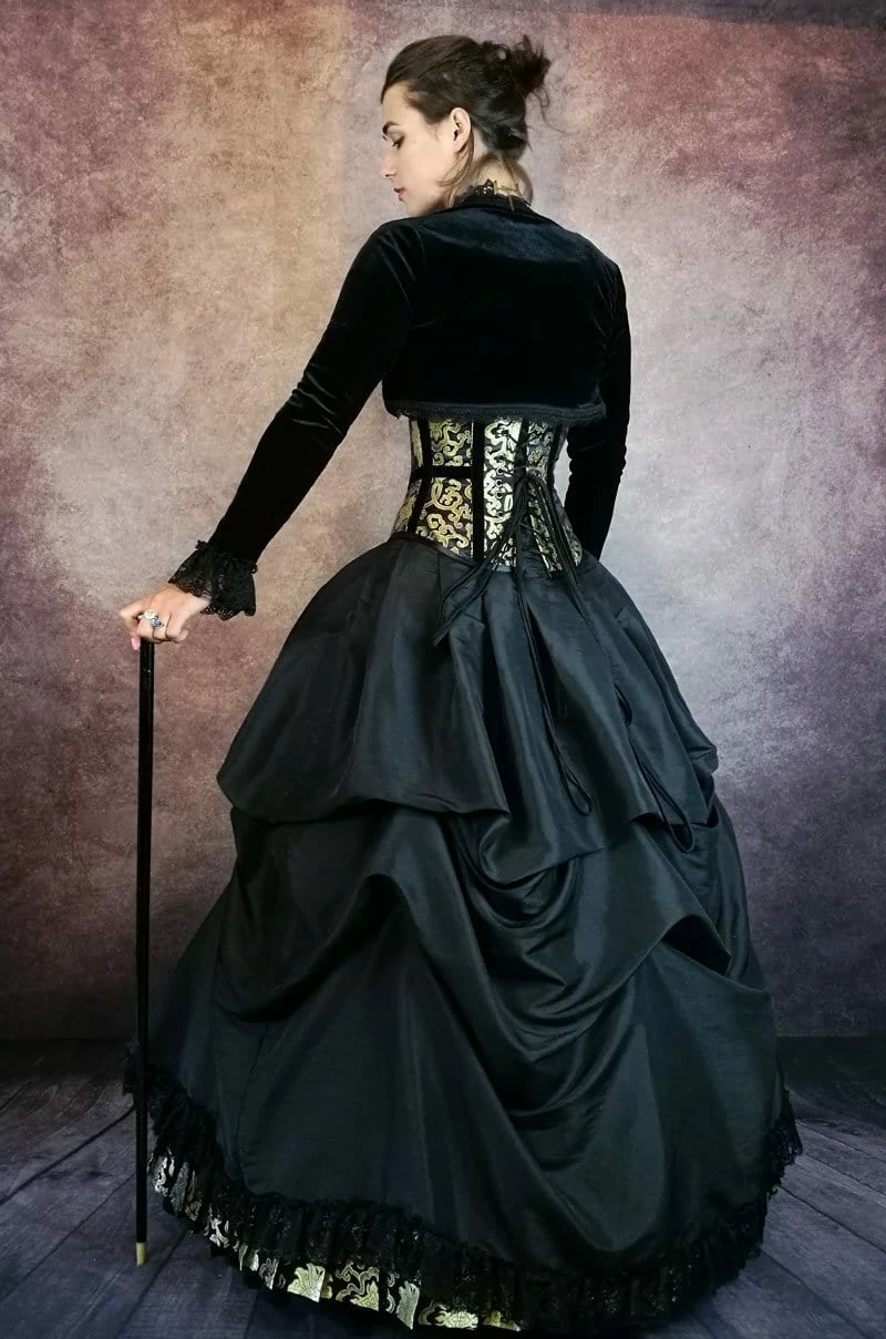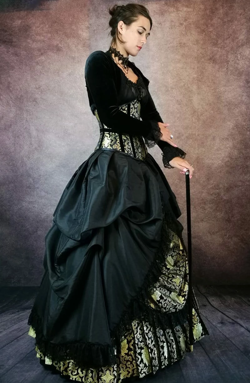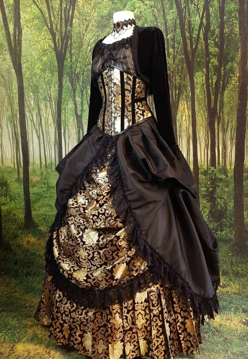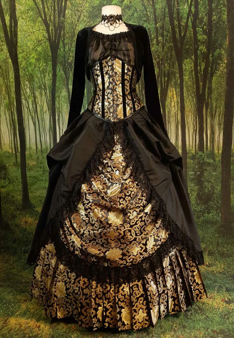 Gold and black shimmers in this victorian oriental inspired corset gown.  Bold and strong, perfect for that stand out gothic crossover wedding or fantastic themed birthday.