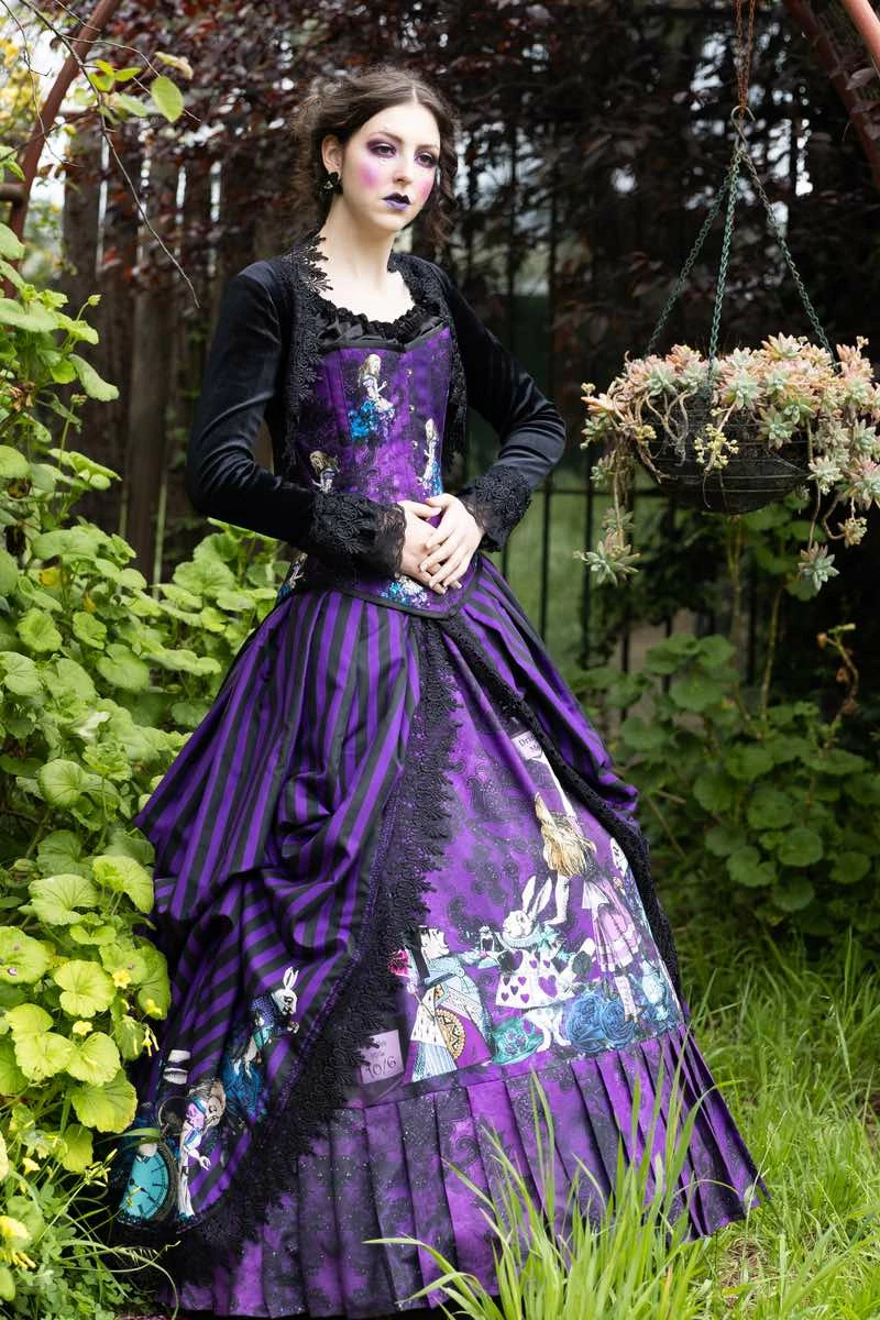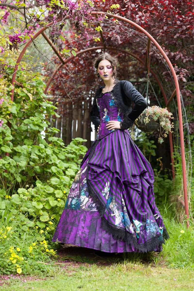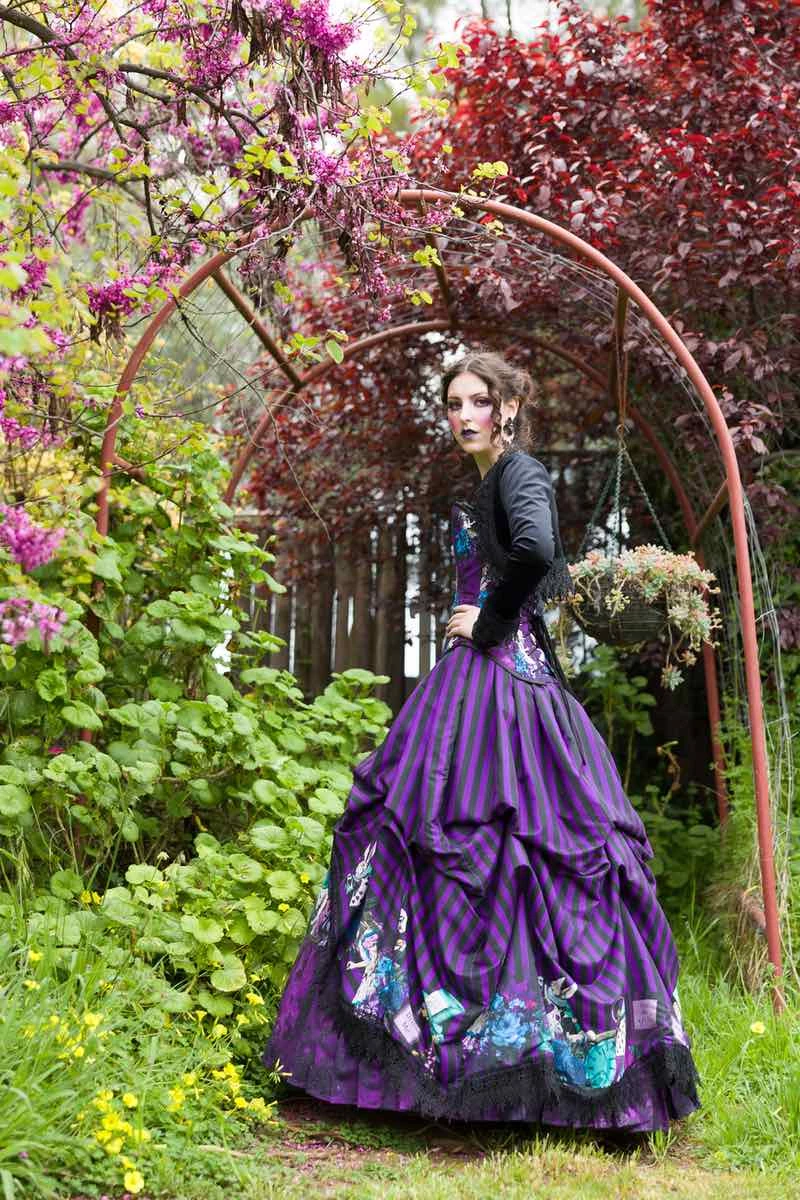 Alice in Wonderland characters come to life on this unique custom sized victorian corset gown / victorian wedding dress.  Designed with the romantic gothics in mind this features Alice on a purple & black background.