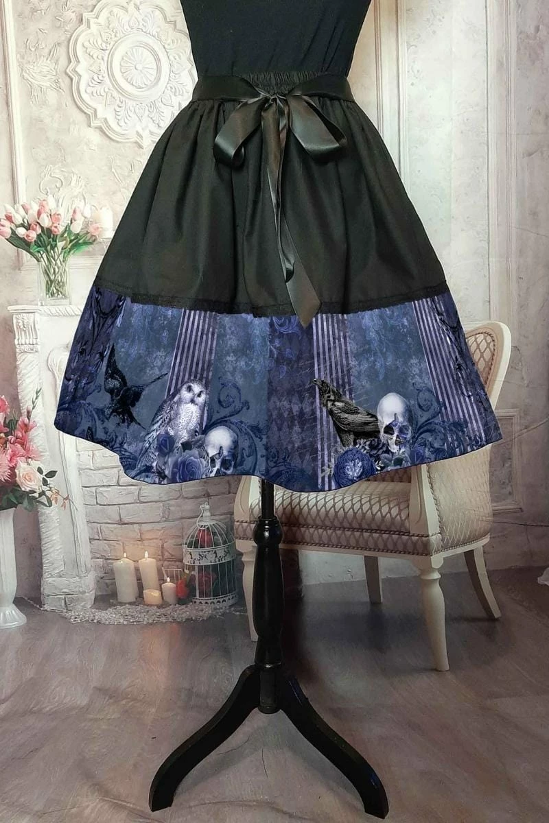 *As the gothic blue memento fabric is custom made for us we may need to order more to complete your order if demand is high. Fabric is usually with us within 2-3 weeks, please let us know if you have an event date for this skirt using the chat button on this page or email [email protected]*