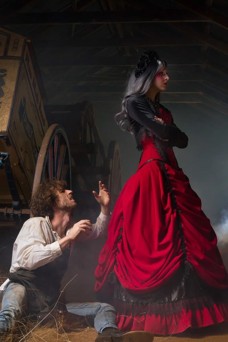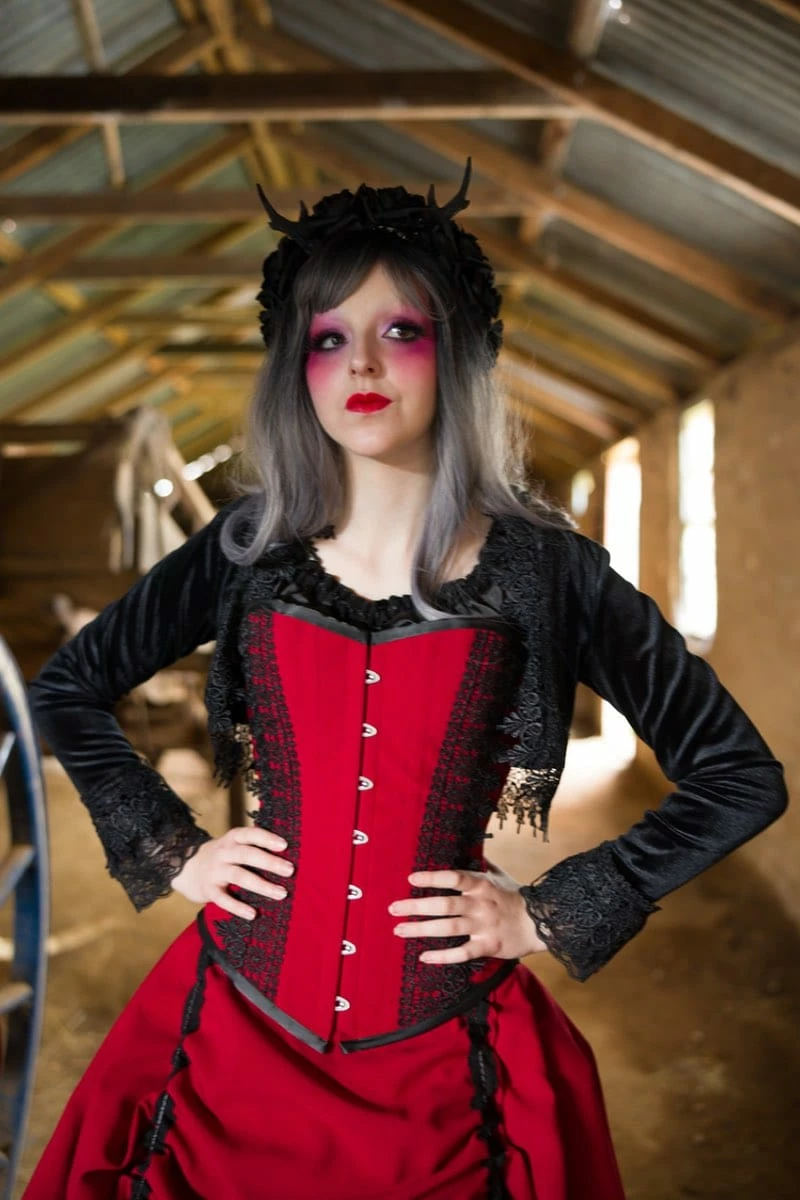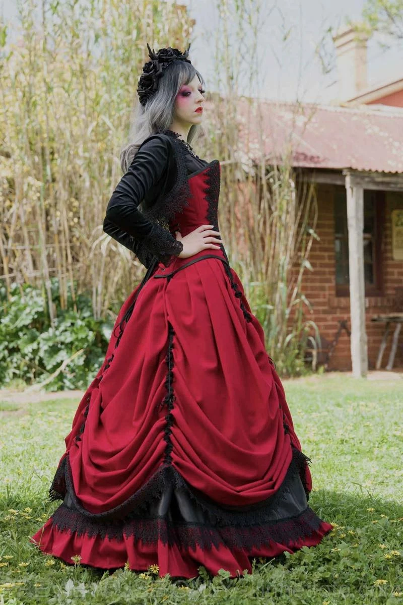 This beautiful gothic red and black victorian corset gown is perfect as a gothic bridal gown for gothic themed weddings, special victorian or steampunk birthdays, gothic proms, festivals or even Halloween.