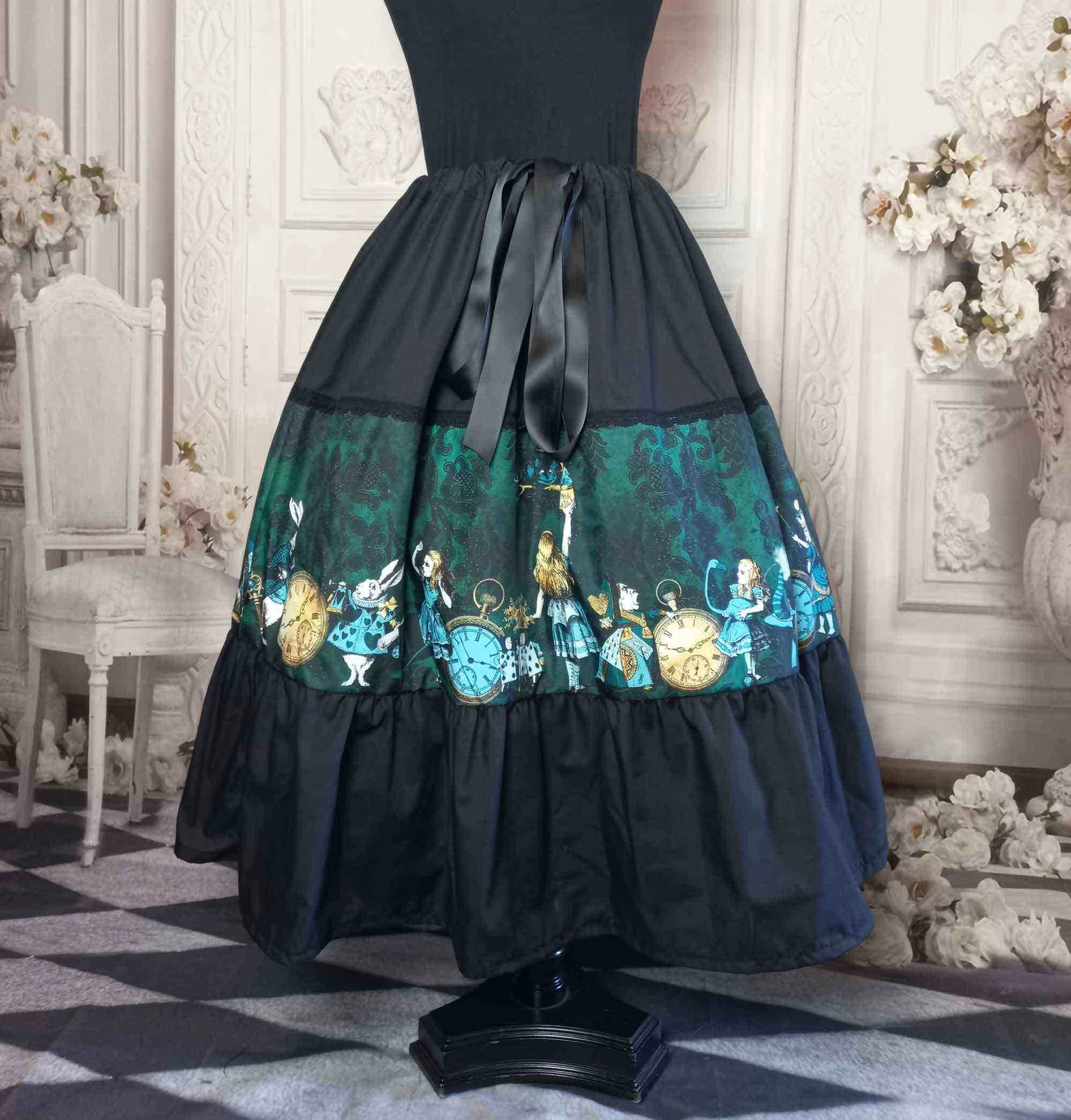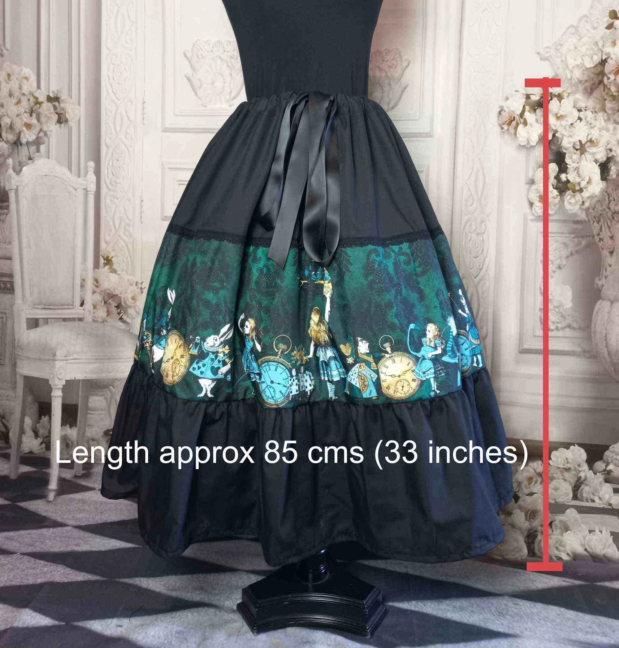 Luscious dark green with aqua highlights in this enchanting tea length skirt featuring Alice in Wonderland characters. Made to order in Australia.
