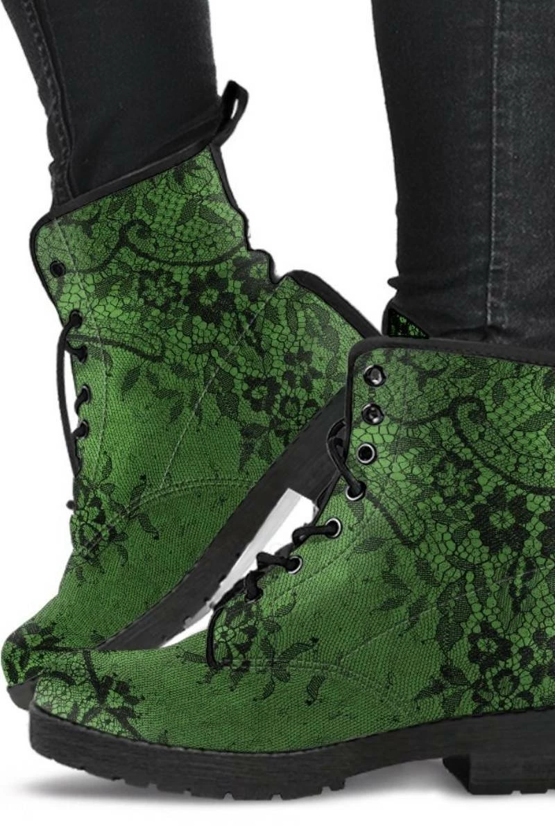Green with black lace overlay comes to life on a pair of custom printed vegan leather boots.