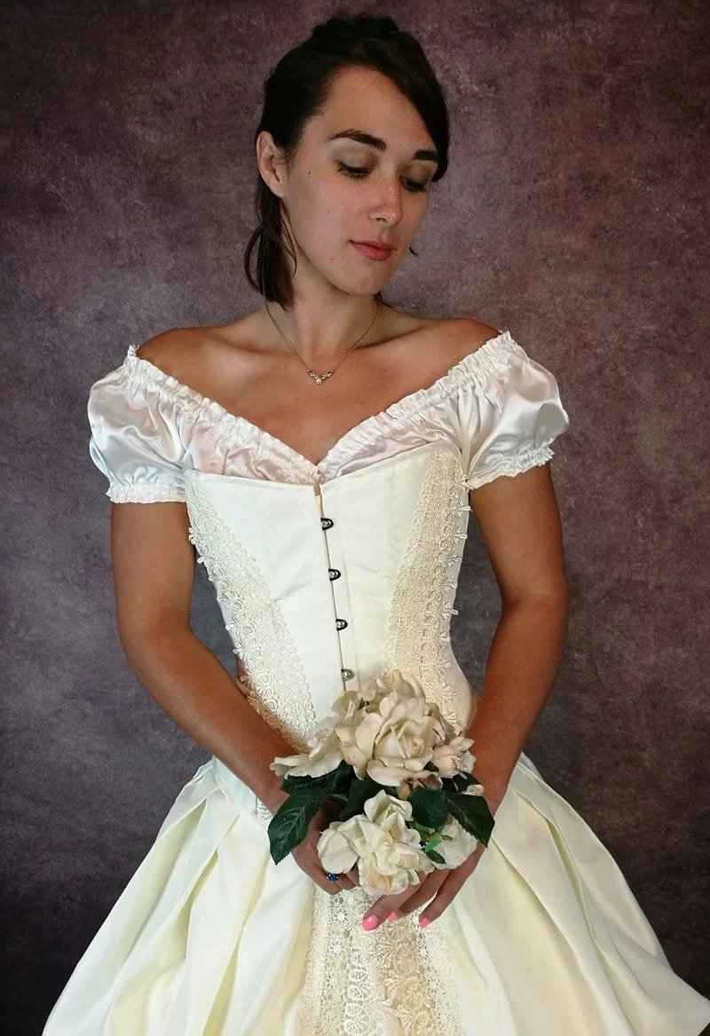 - Please note – the lace braid trimmed Vivianne top under the corset is no longer available as an option – the Classic chemise (with a slightly more arm covering sleeve) is available as shown or available as a sheer, soft long sleeved version.