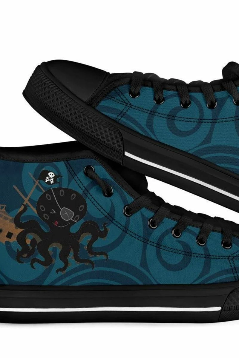 - Full canvas double sided Pirate Kraken Ocean print on black with a rounded toe construction.