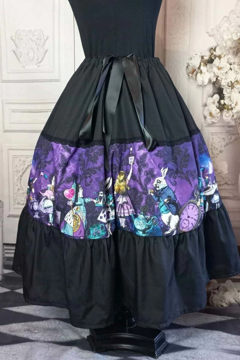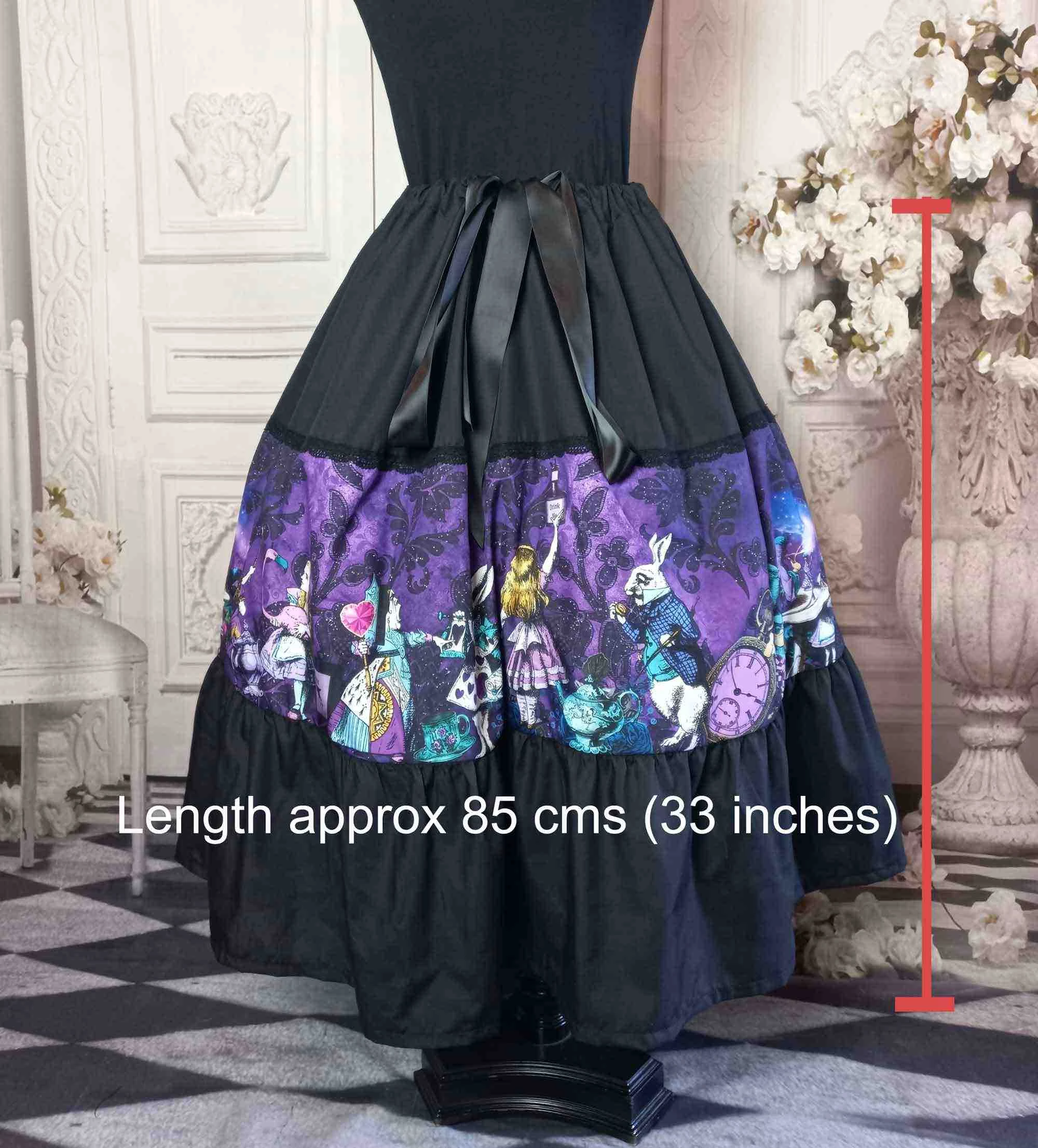 Luscious gothic purple with aqua highlights in this enchanting tea length skirt featuring Alice in Wonderland characters. Made to order in Australia.