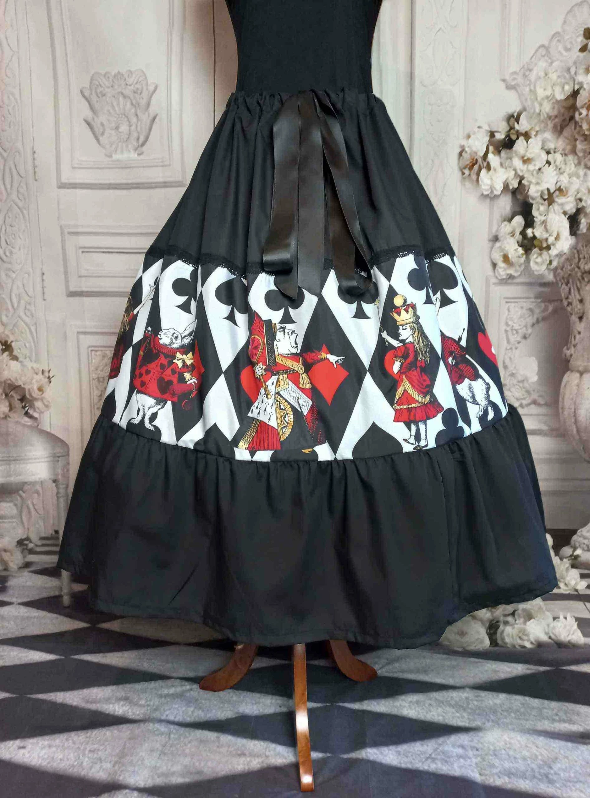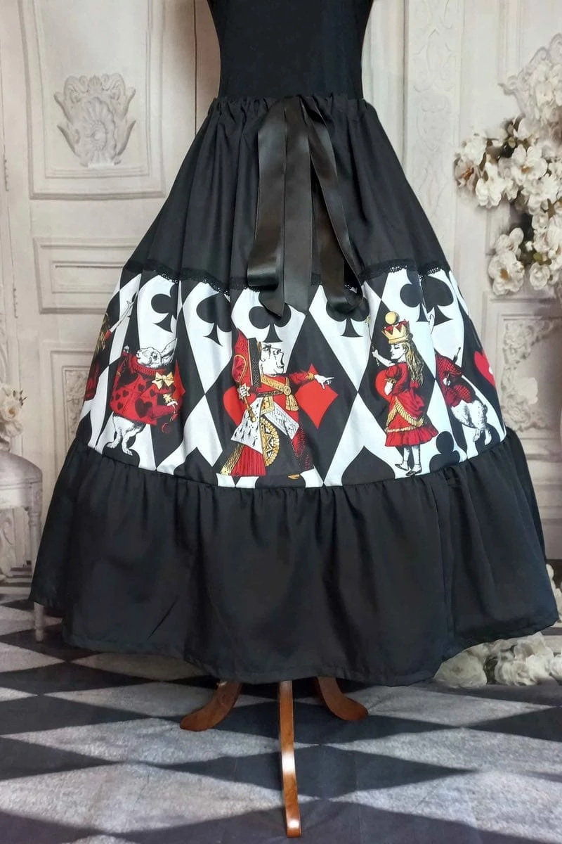 Queen of Hearts Alice in Wonderland print skirt, fun and delightful tea length skirt. Made to order in Australia.