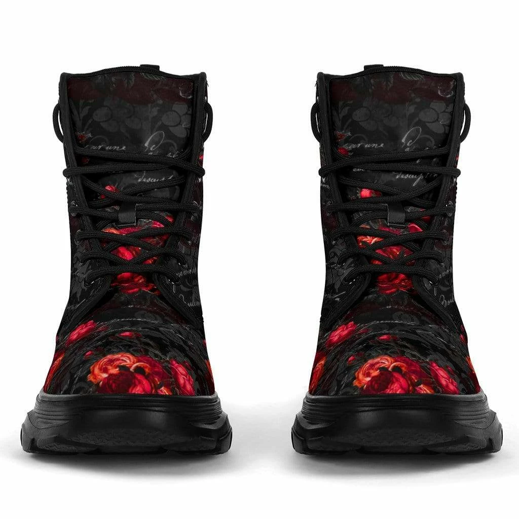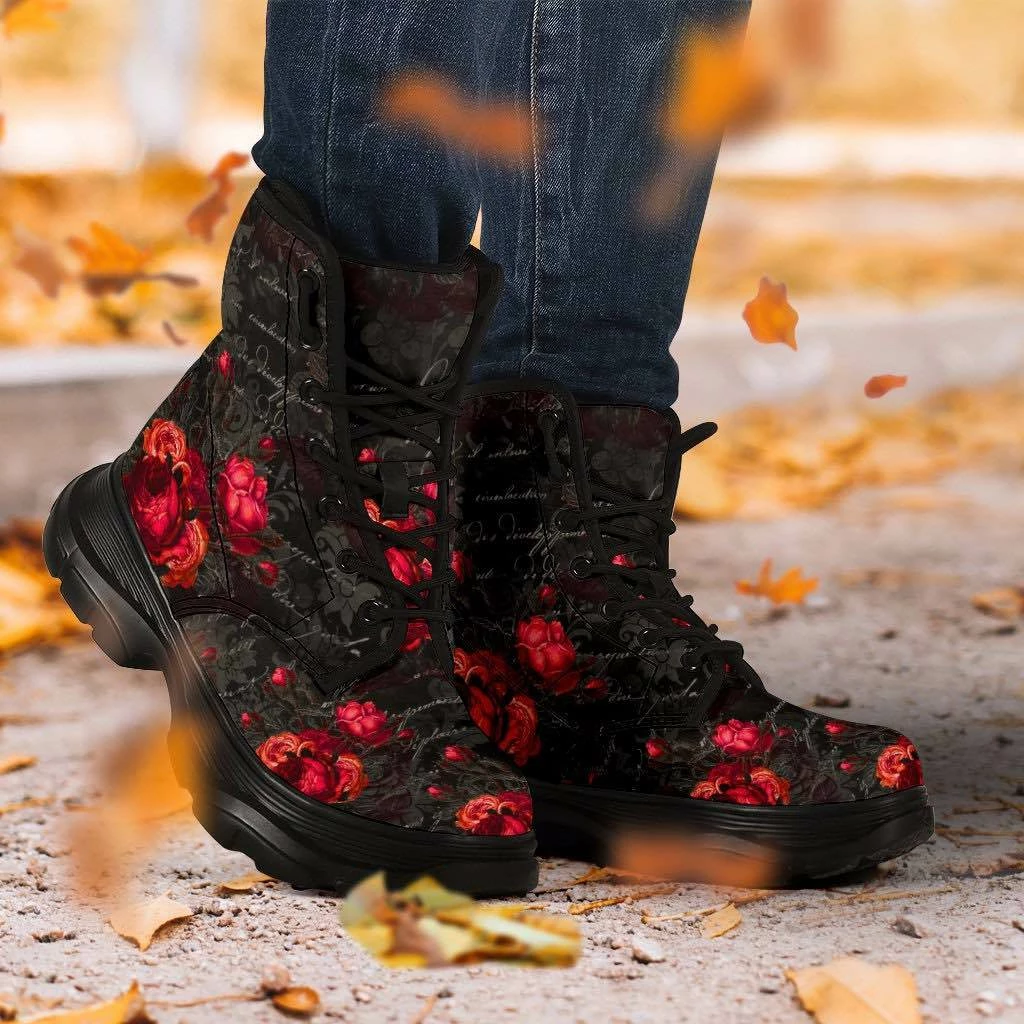 Gothic Red Roses and script – cute comfy custom made & printed chunky boots.