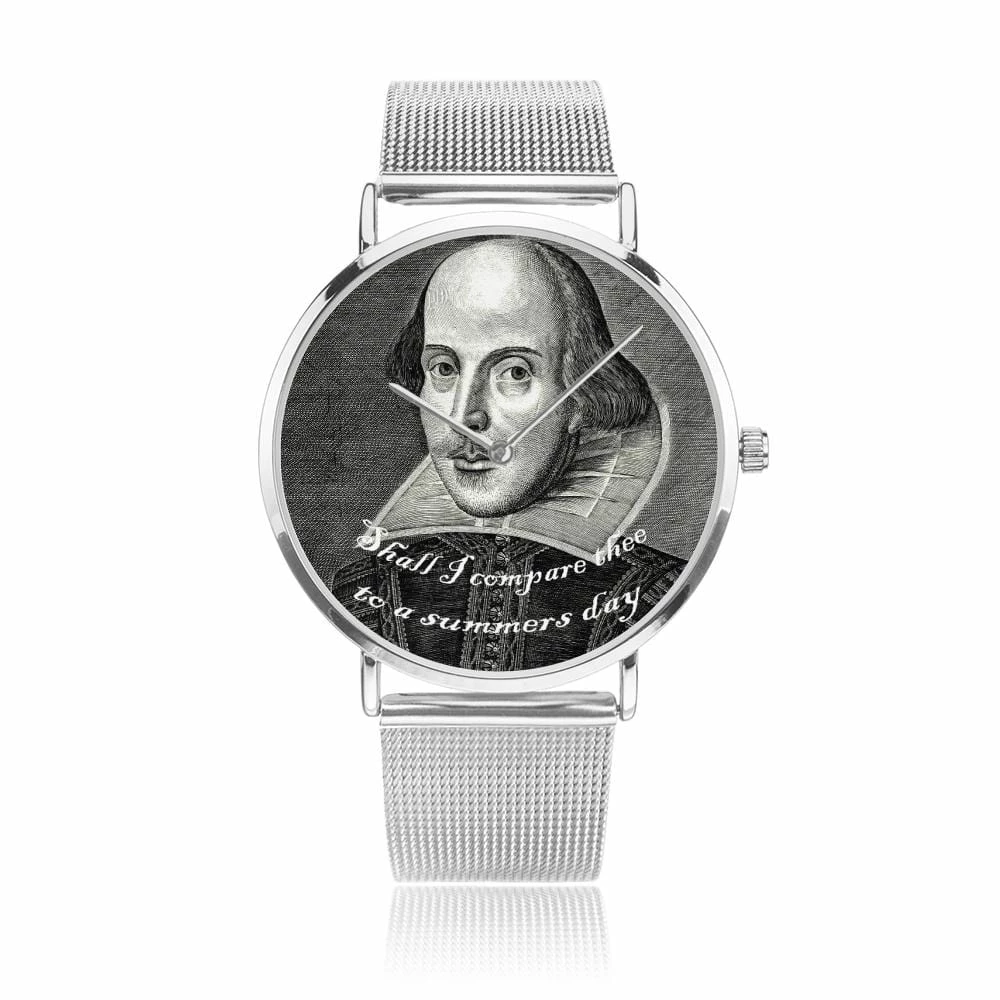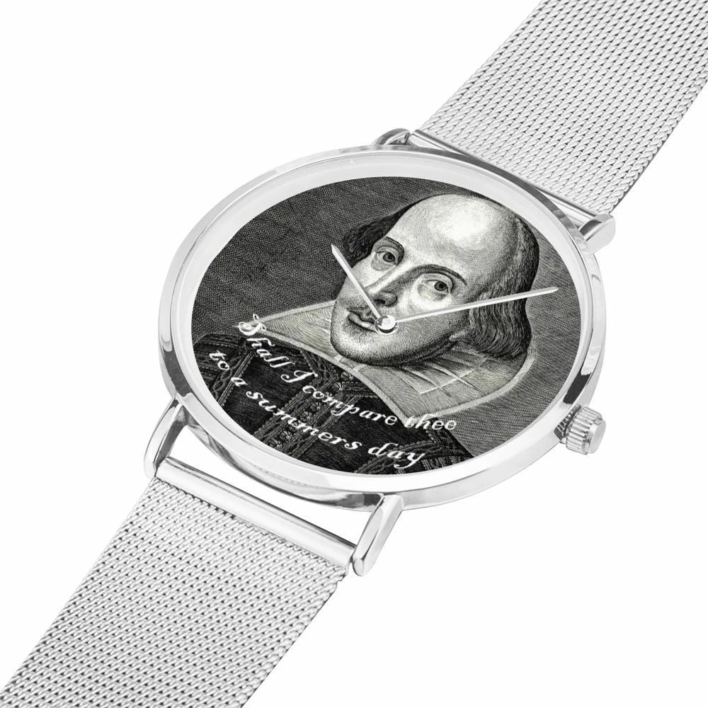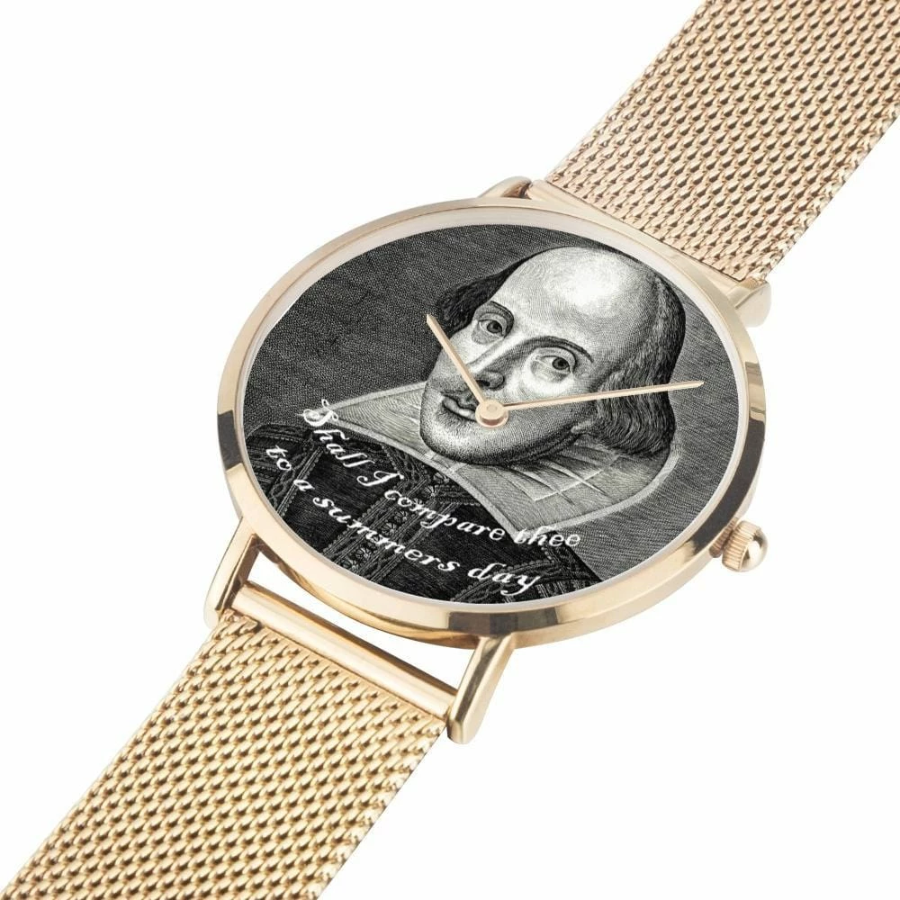 “Shall I compare thee to a summers day” – famous quote from the most famous bard of all time is printed on the watch face along with a classic image of Shakespeare.