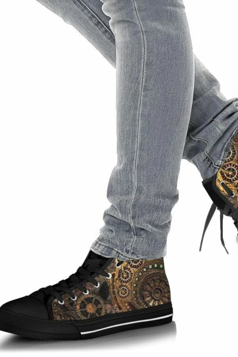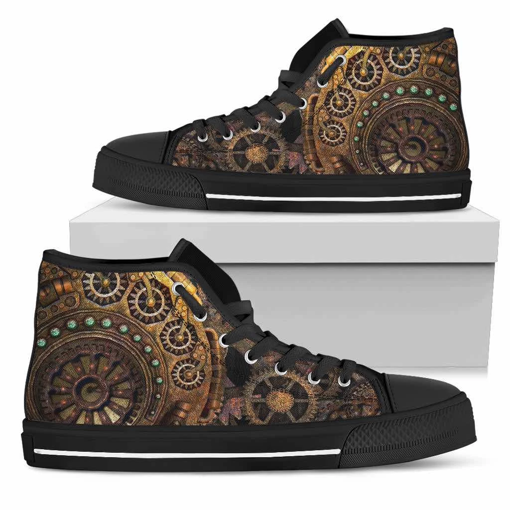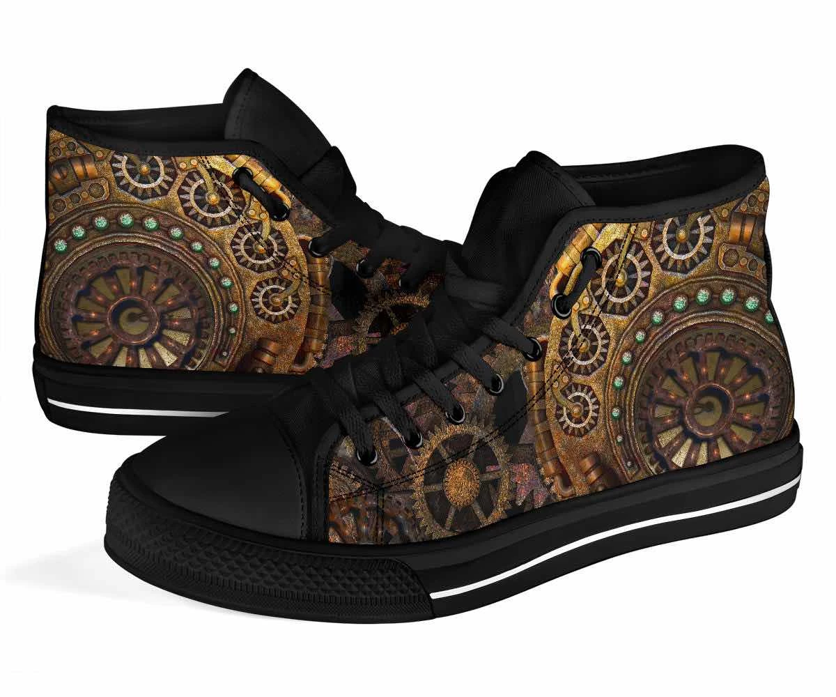 - Full canvas double sided steampunk clockwork gears print on a quality high top sneaker with a rounded toe construction.