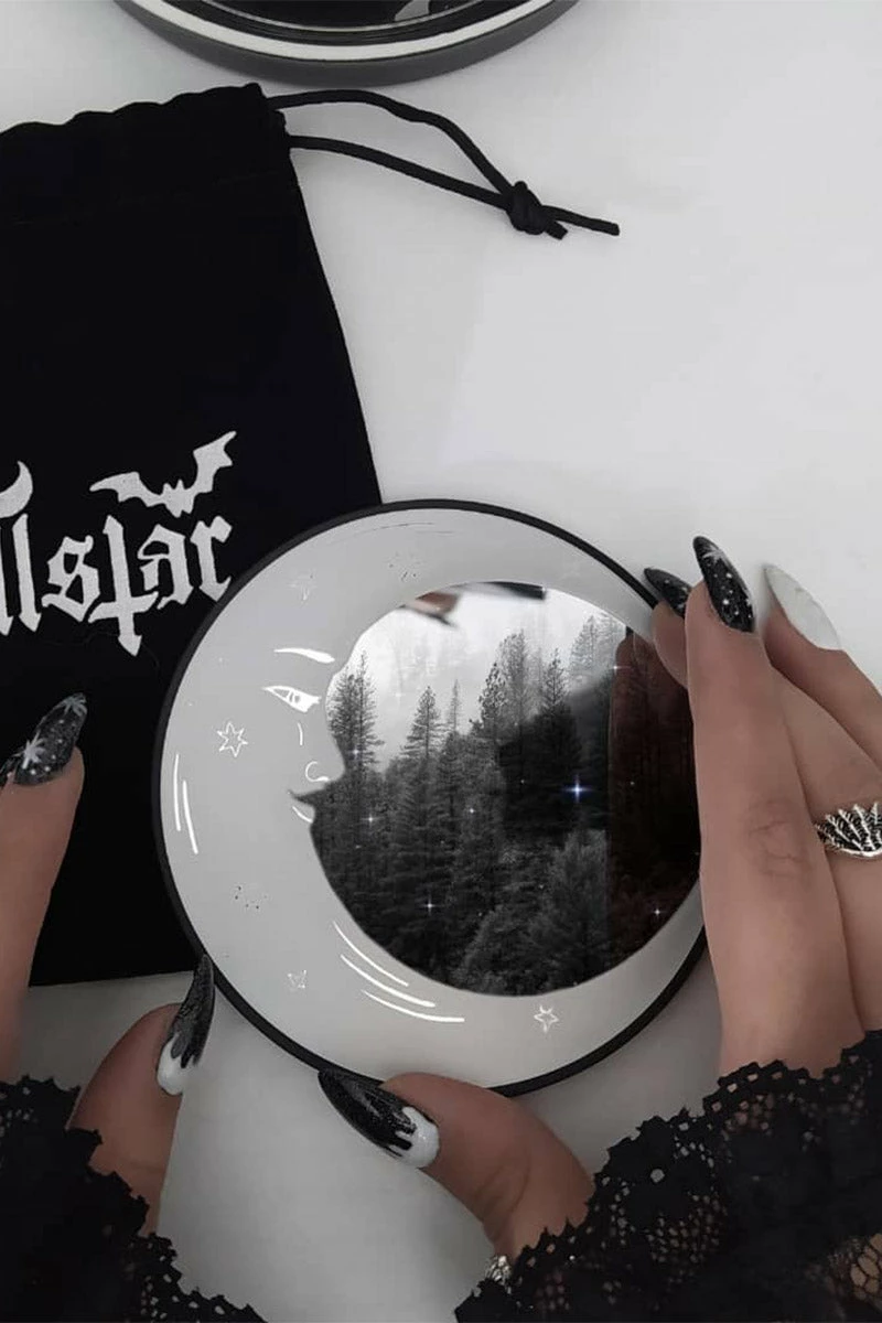 Add your own dash of moon magic to any day, anytime; the enchanted ‘Astral Body’ round hand mirror is perfect for your finishing touches! The perfect size to keep in your bag, with black iron finish and crescent moon decoration.