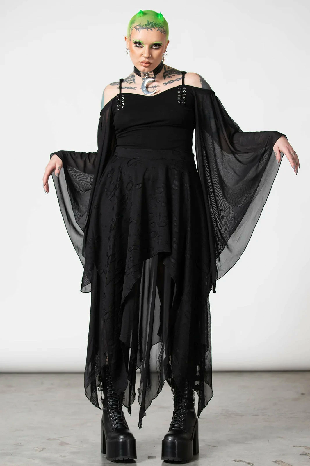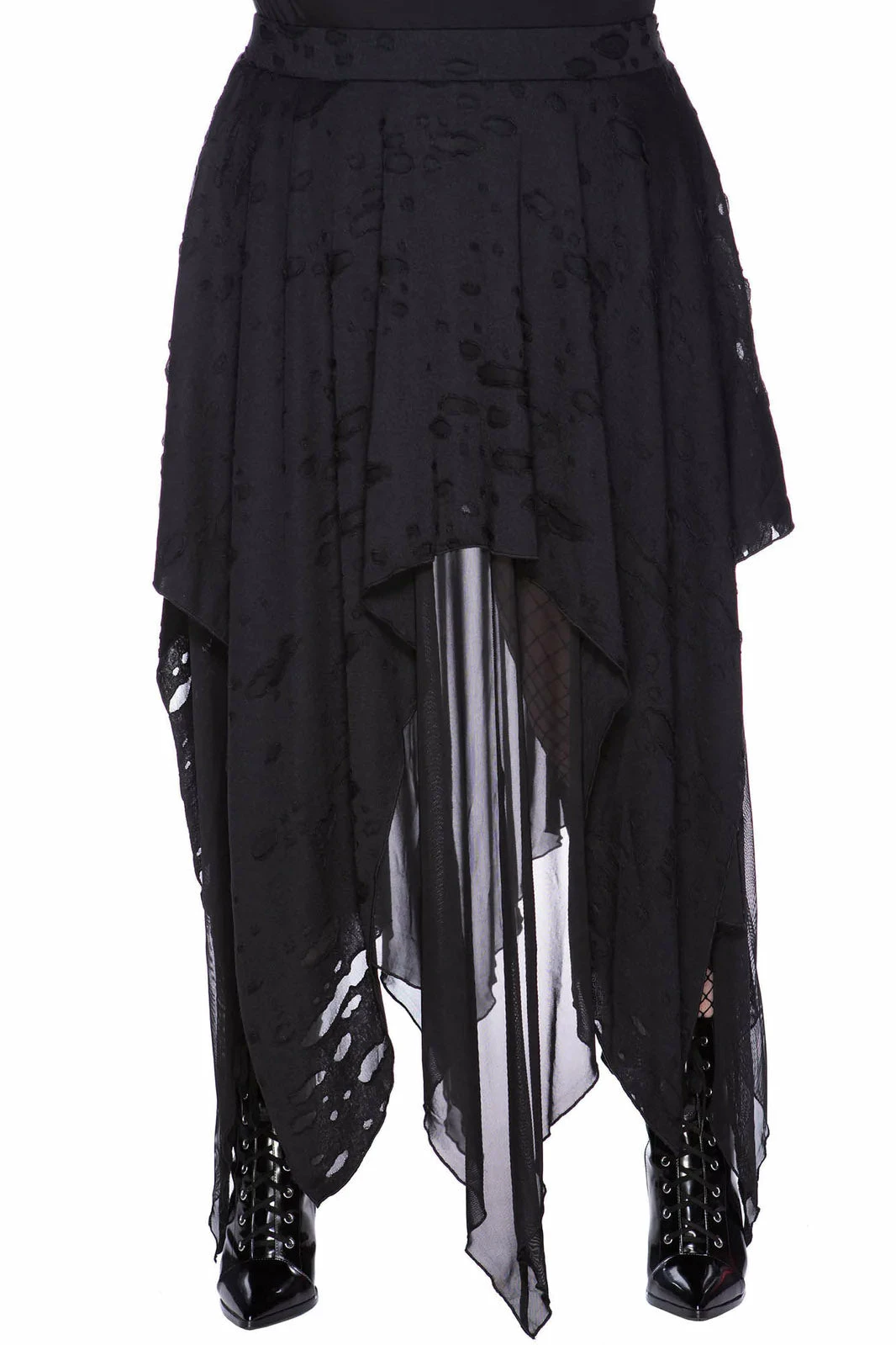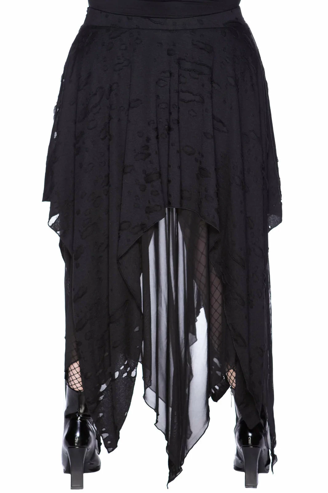 He that dares not grasp the thorn – should never crave the rose. Feel entirely divine in the ‘Death Valley’ skirt. Combining darkness and decadence perfectly – conjured using a super soft fabric which drapes and stretches perfectly for a killer fit! Complete with distressed details and a hanky hem, this statement piece is an opulent addition to any dark vamps collection – looks deadly dressed up or down!
