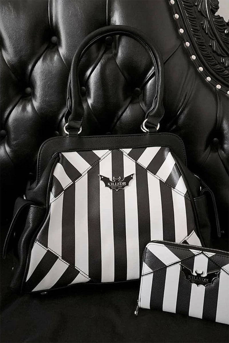 Elevate yer handbag game with this statement must-have; ‘Never Trust The Living’ is finished in a faux leather body adorned with a block-stripe print, branded bat plaque, multiple storage pockets, and zip closure. Detachable shoulder strap when you need it and of course fully lined. Halloween is every day!