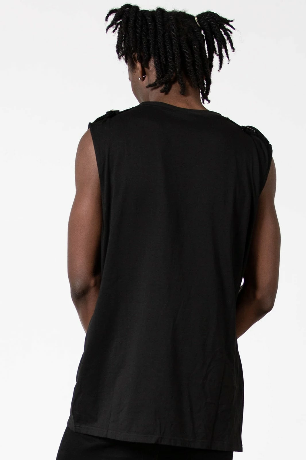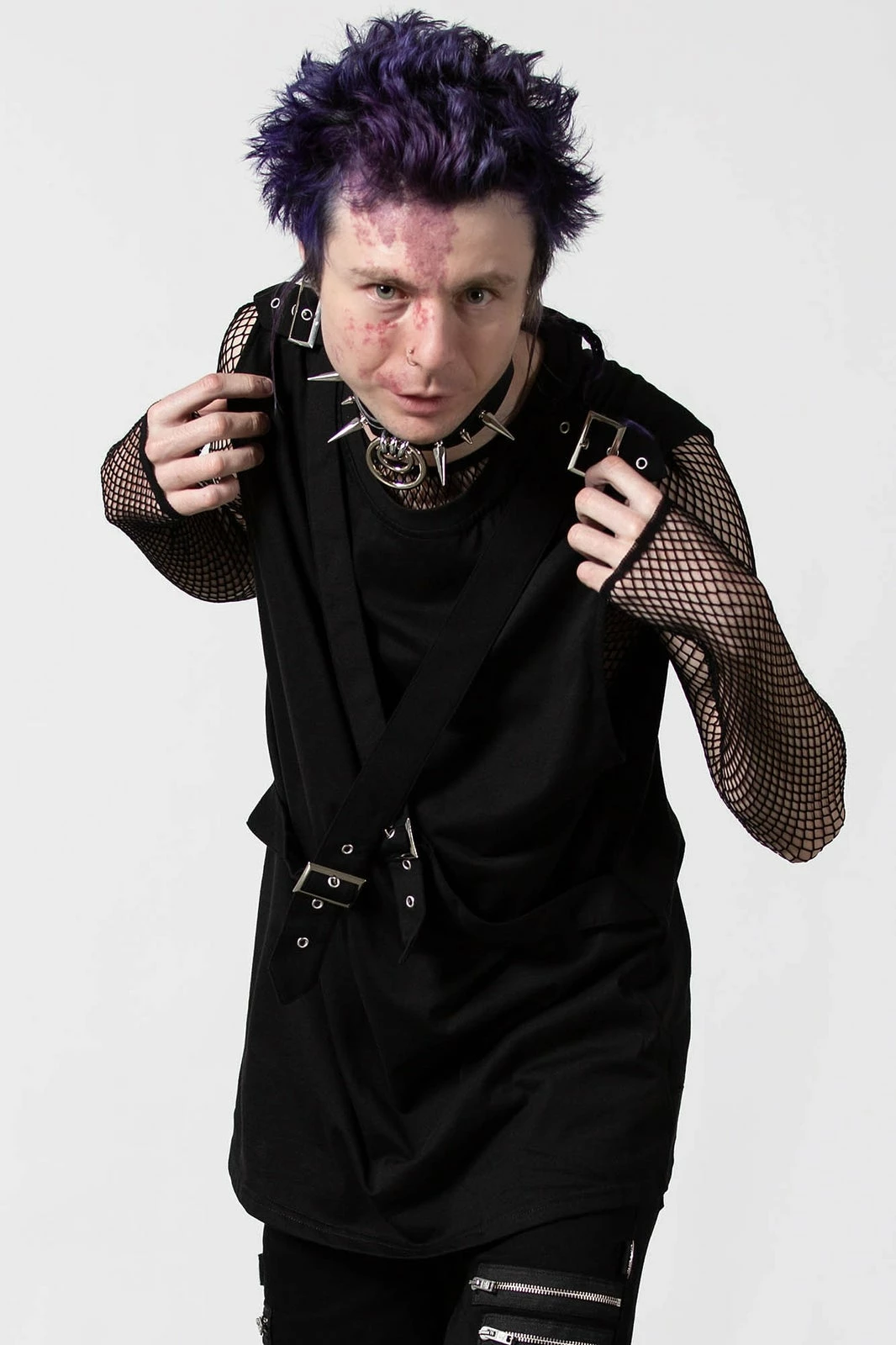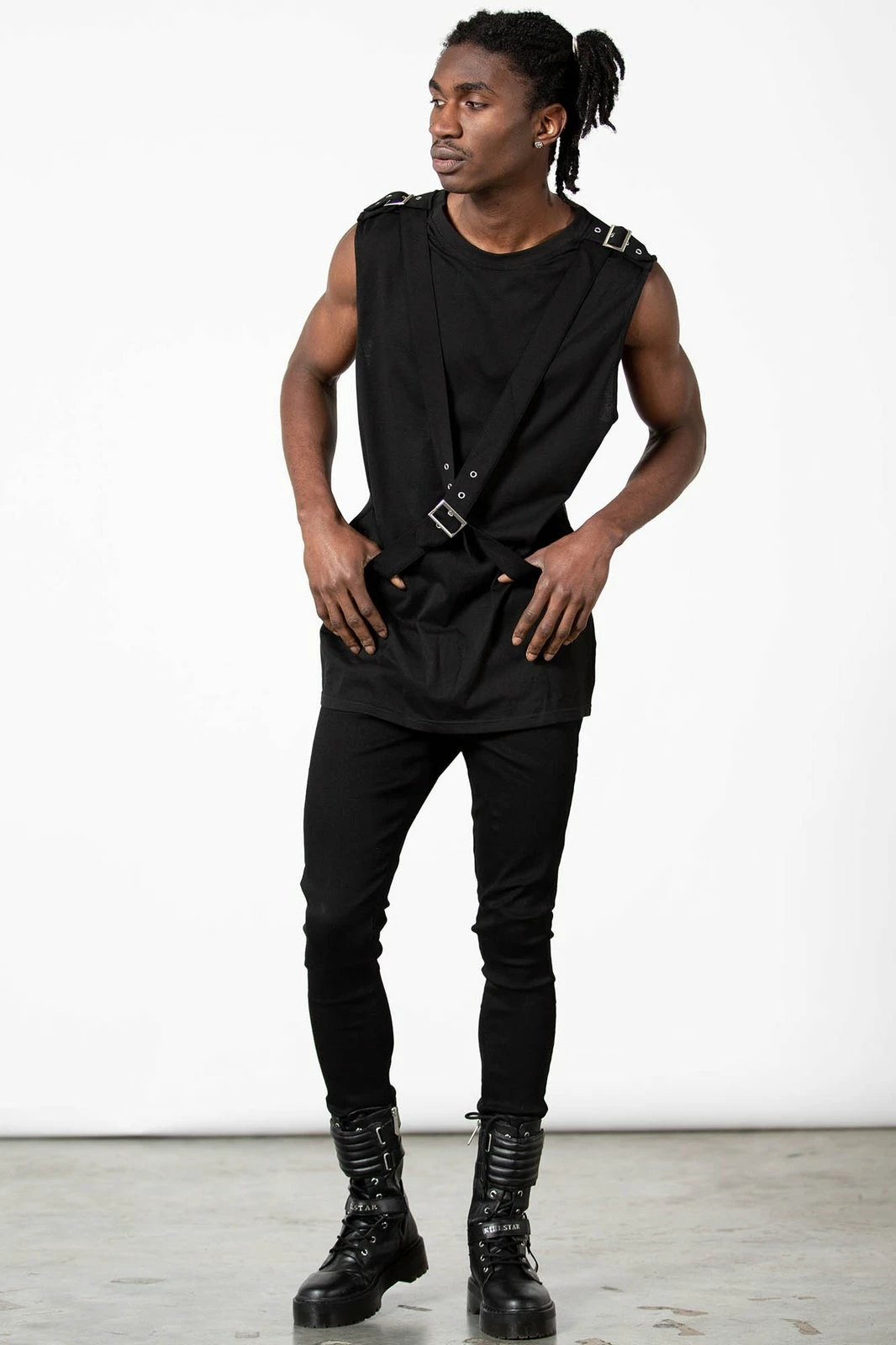 Classic fit vest with some extra length – in a superior smooth jersey fabric with statement straps and buckle accents.