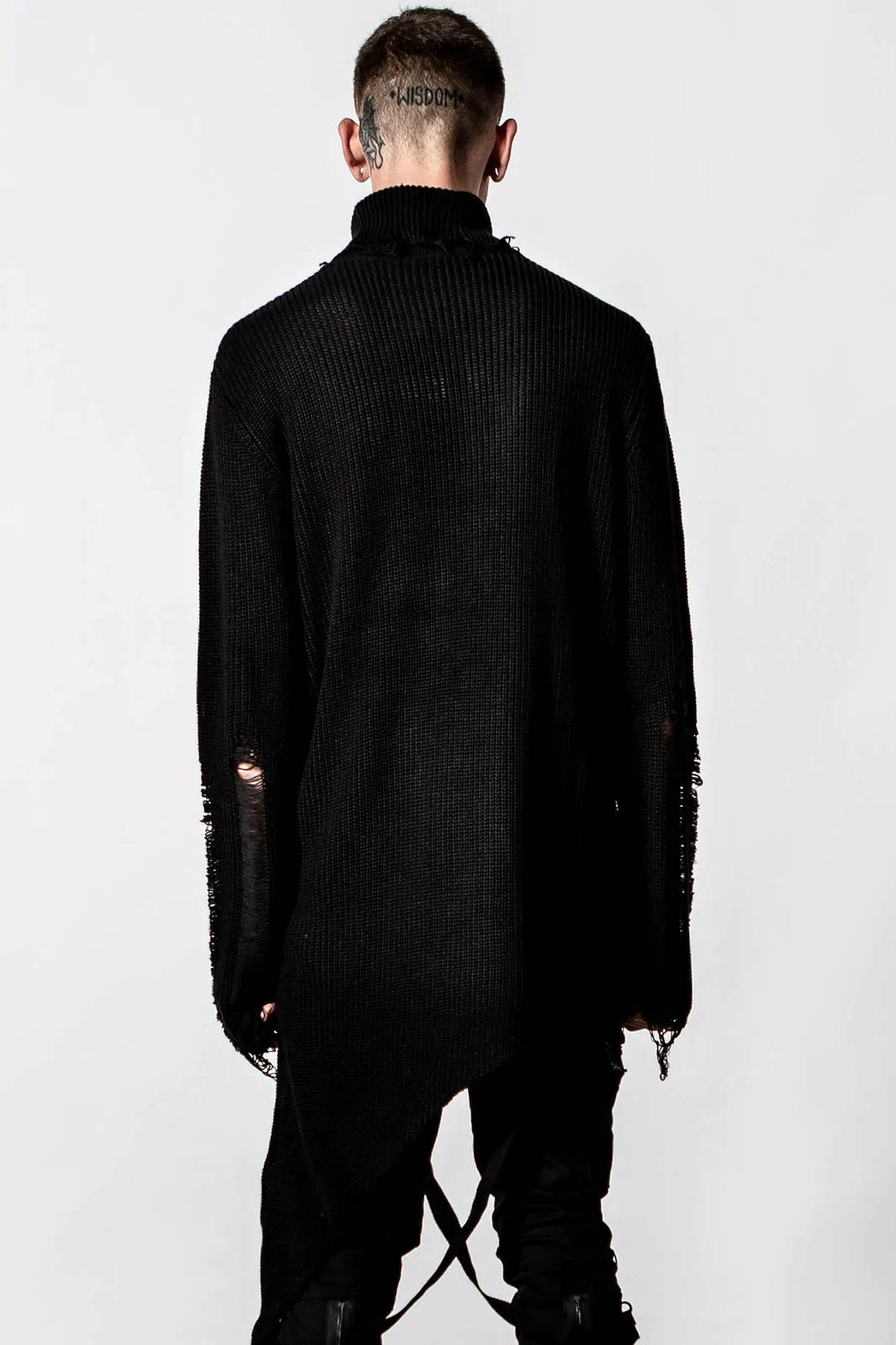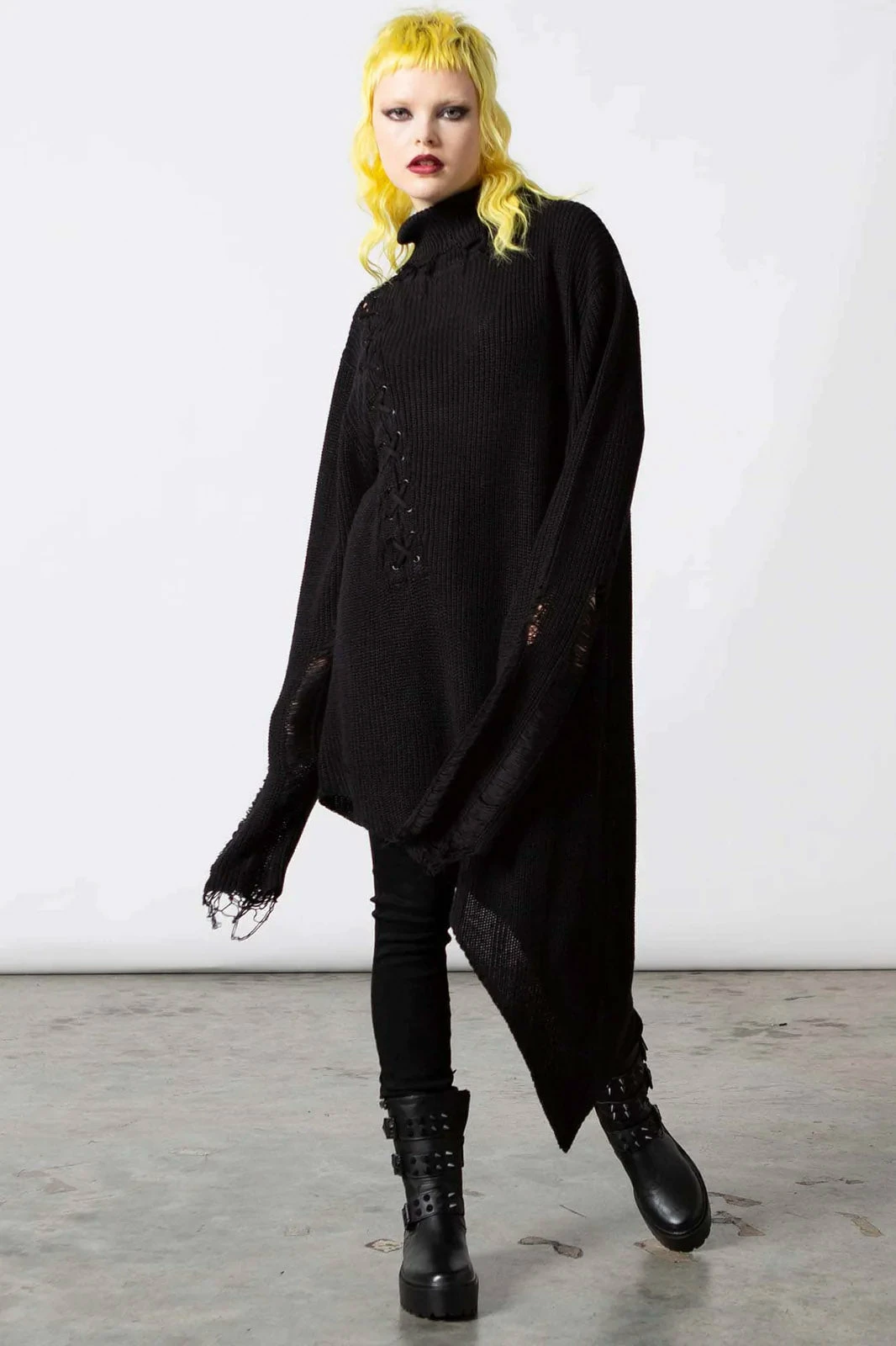 Channel some quintessential goth vibes with the ‘Placebo’ knit sweater, perfect for layering – or wear as a statement piece. High neck and with lace-up accent on one side. Features distressed detailing and long sleeves. Ideal for festivals, midnight promenades with the moon and hungover Sundays.