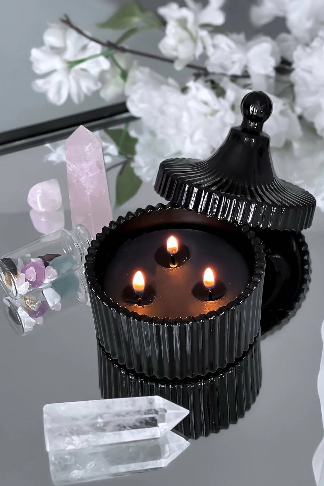 This boudoir candle is everything! In a ceramic container with lid, black wax and lightly scented, no altar, crypt or bedroom should be without one.
