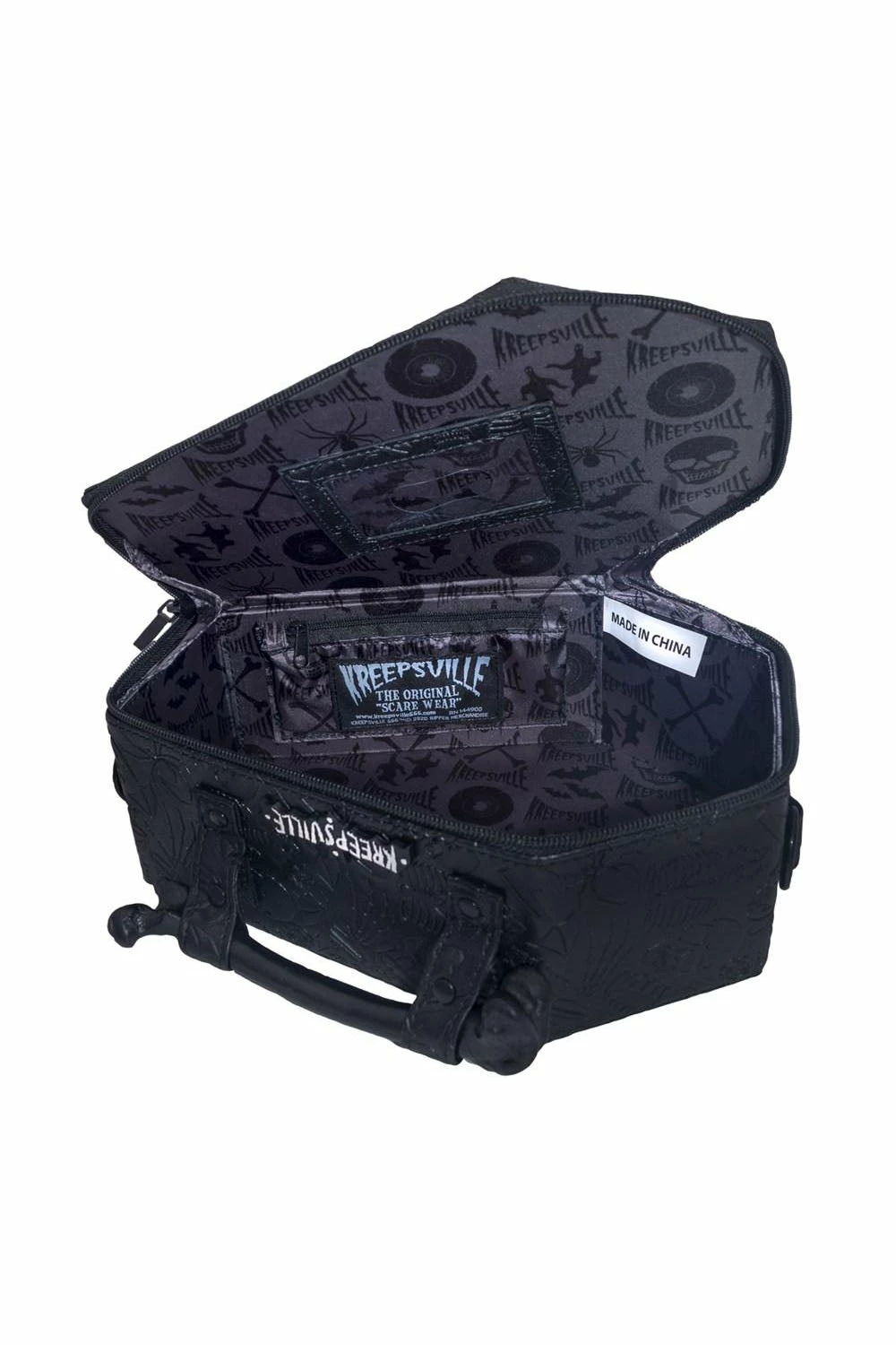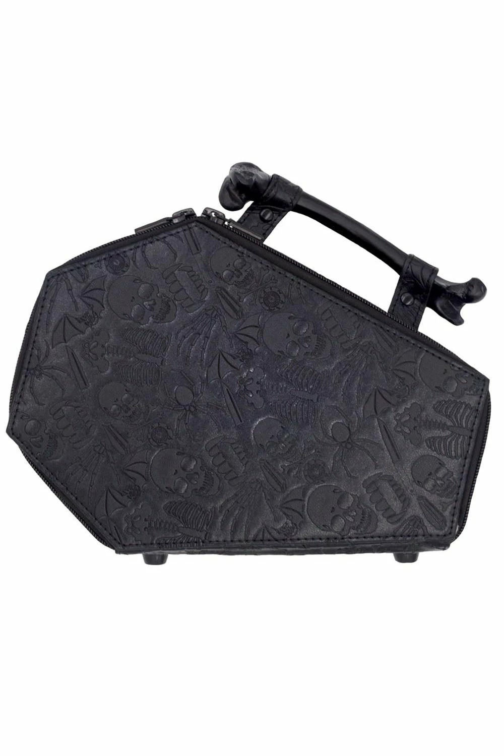 Conjure some ghoulish glam with this gorgeous purse, shaped like a real coffin! This goth purse is complete with an embossed design, loaded with skeletons, bats, spiders, vampire fangs, and eyeballs! The handle is shaped like a bone, and the strap is detachable for those dayz you wanna keep it creepy + casual. Â