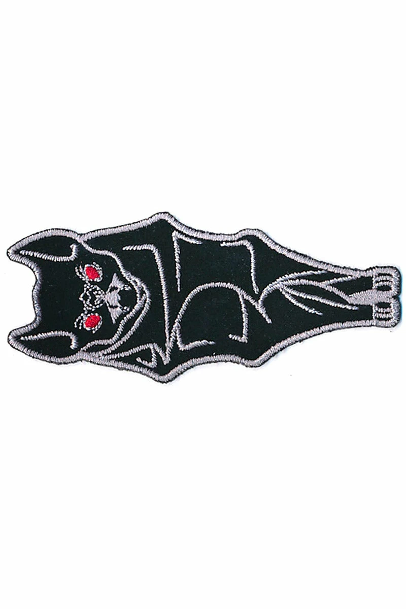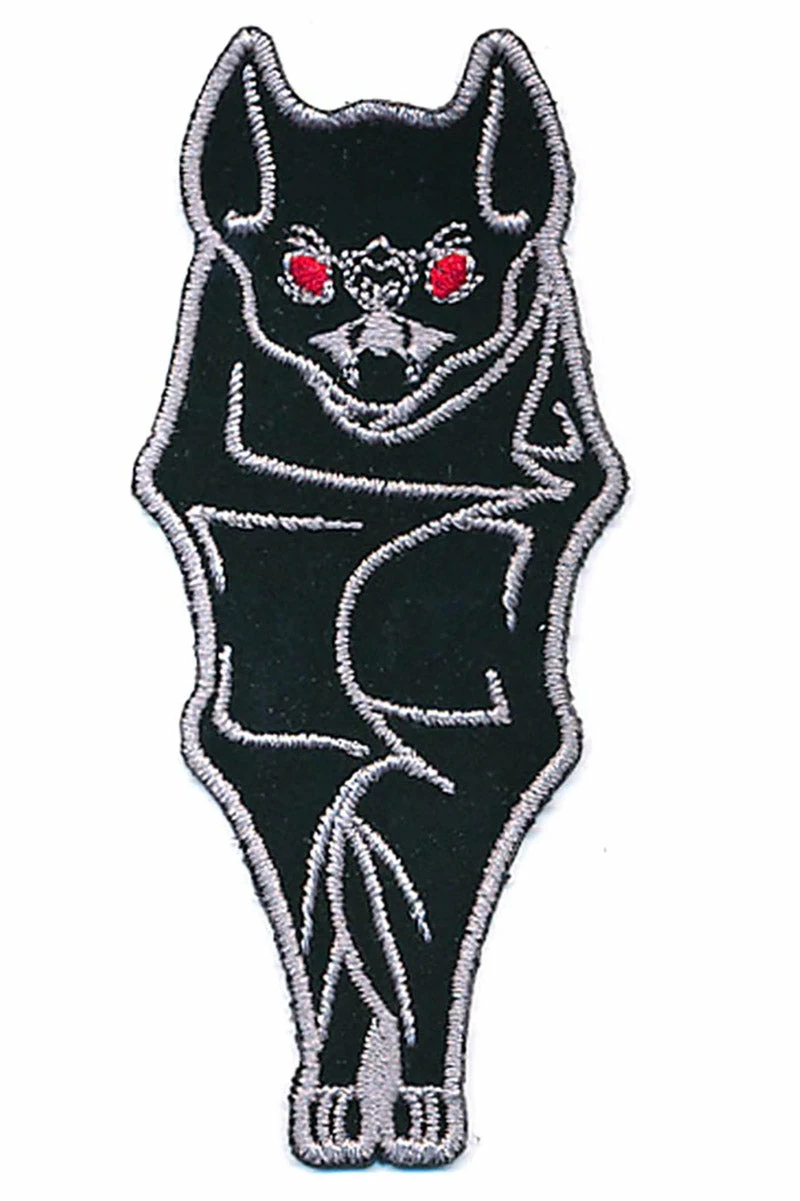 Go batty with this creepy critter, dying to haunt your goth clothes! Painstakingly embroidered, this haunting patch features a hanging bat complete with blood-red eyes, fiendish fangs, and contrast grey outline. Finished with iron-on backing so you can easily attach this creature of the night to your pants, battle jacket, vest, or anything else your dark heart desires.