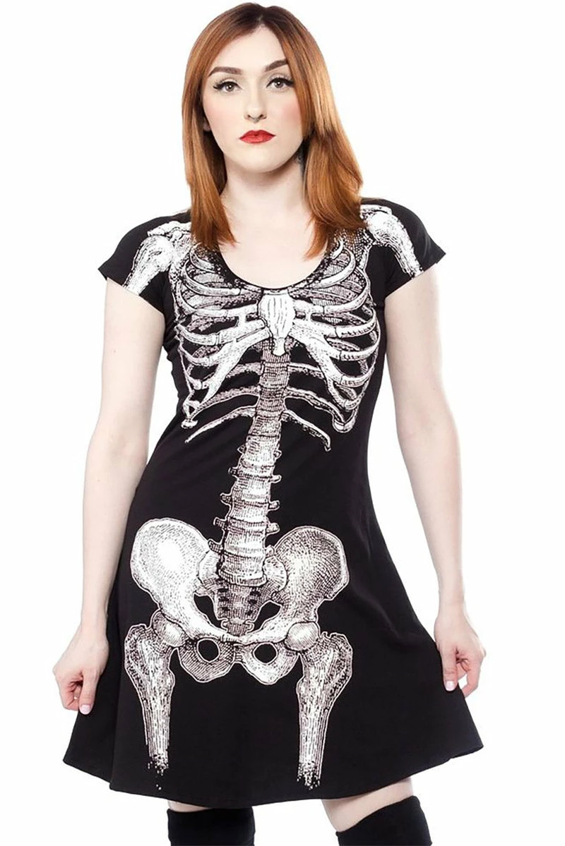 Give ’em femur in this spooky skeleton dress! You’re the living dead girl they can’t forget in the flattering flared fit, darling cap sleeves, and deep scoop neck. Kick it in comfy creepy style in the distressed skeletal print, designed to look like real human bones. Wear this gothic mini dress with stockings and mary janes to be the cutest ghoul in school.