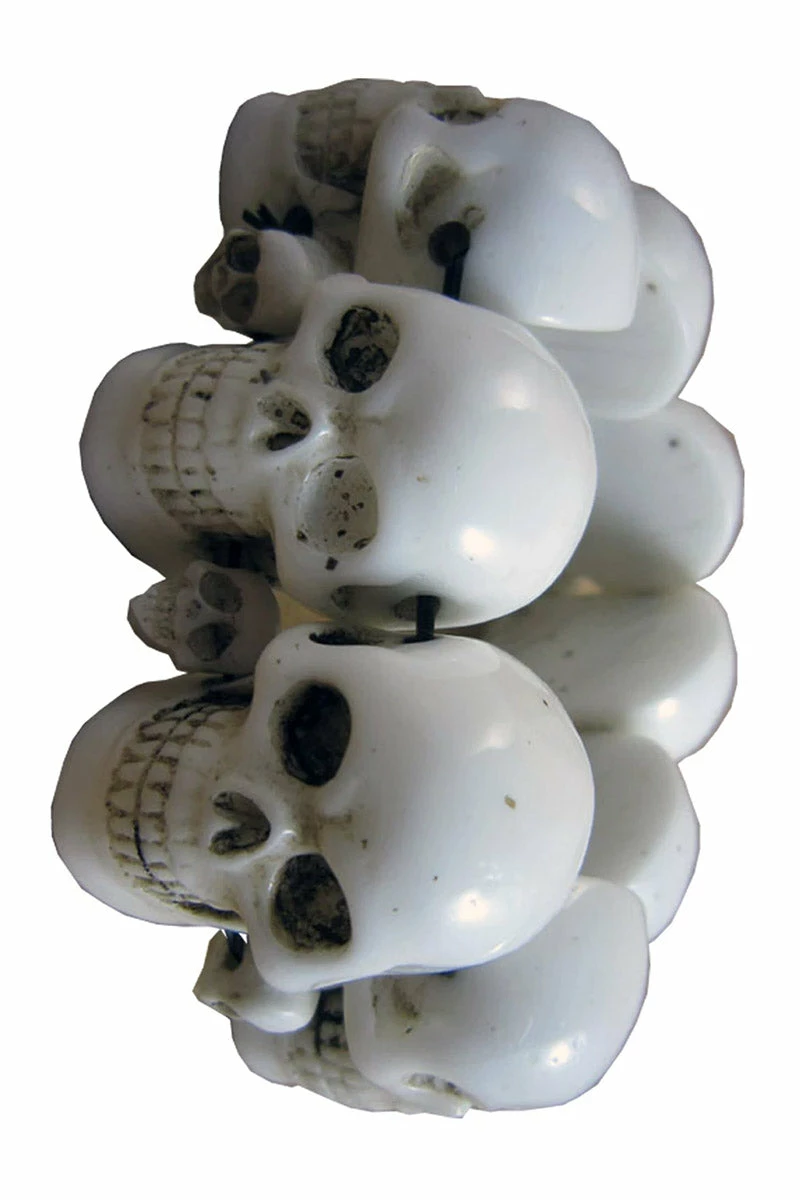Haunt your wrists with this wicked skull bracelet! A legion of ghostly-white human skulls of various sizes possess the elastic band—stretchy as hell to please your cold, dead heart. Hexed with distressed details to keep you feelin’ creepy.Â