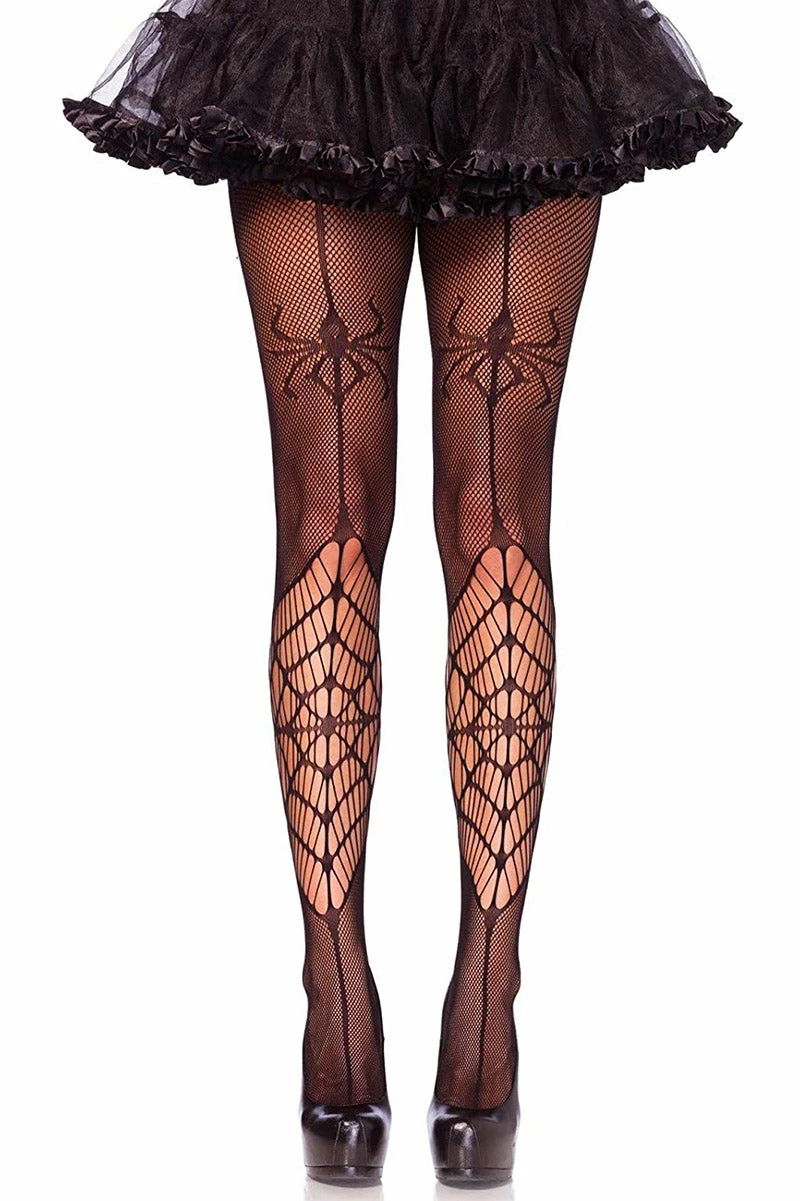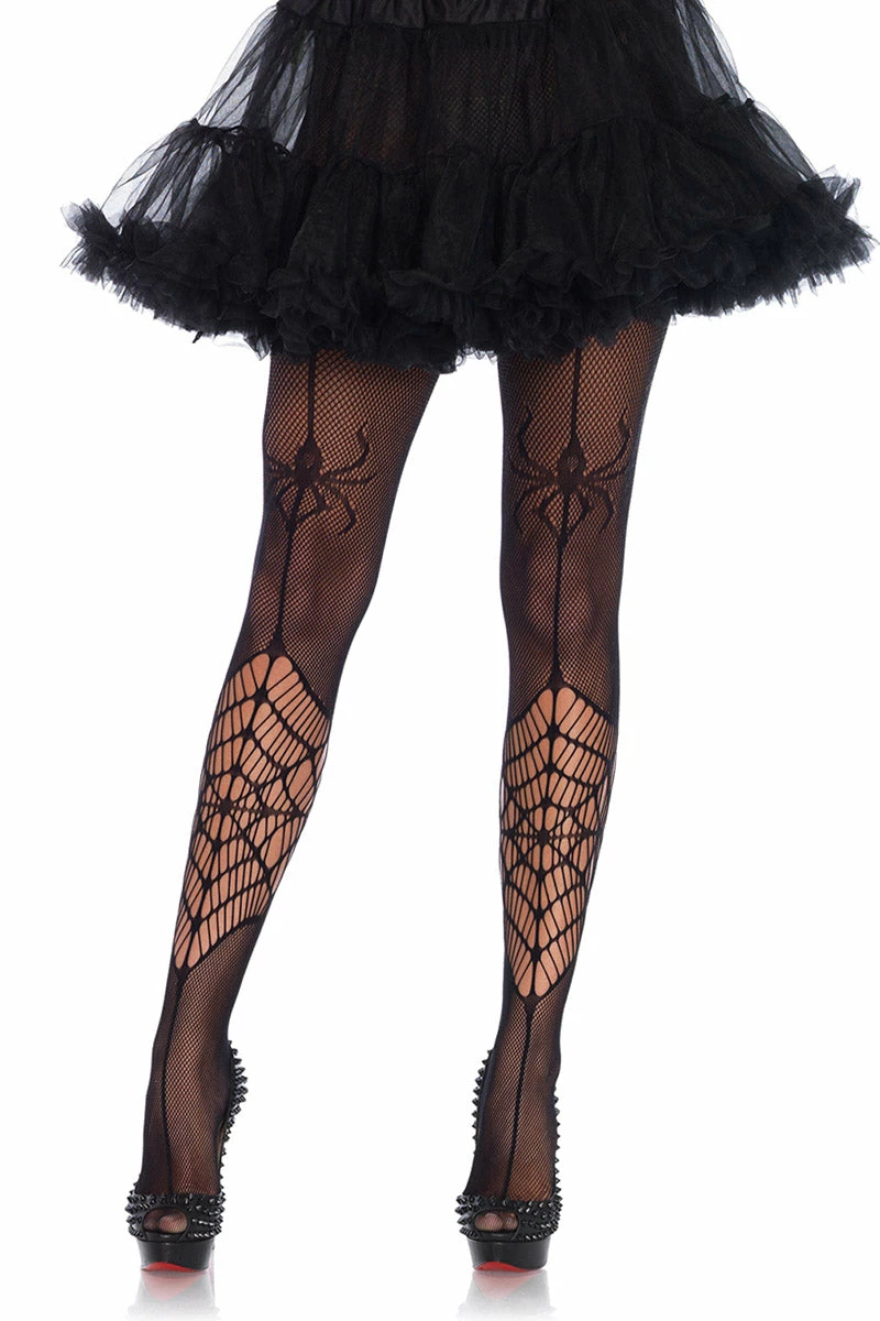 Spin some style in these beautiful black widow stockings! Delicate and detailed, these romantic goth tights feature spiders on the thighs weaving intricate webs down the legs. Made of sinfully soft fishnet for a bit of burlesque.