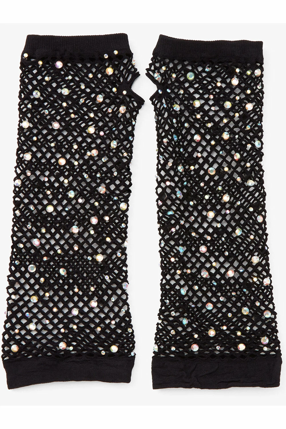 Protect your arms from the elements in these fierce fishnet gloves! Summon sexy spooks in the fine black fishnet construct, starstruck with gleaming rhinestones! Sinfully soft, these fishnet arm warmers feature a fingerless design, with thumbhole and pinky hole cutouts so you can freely text and hex.Â