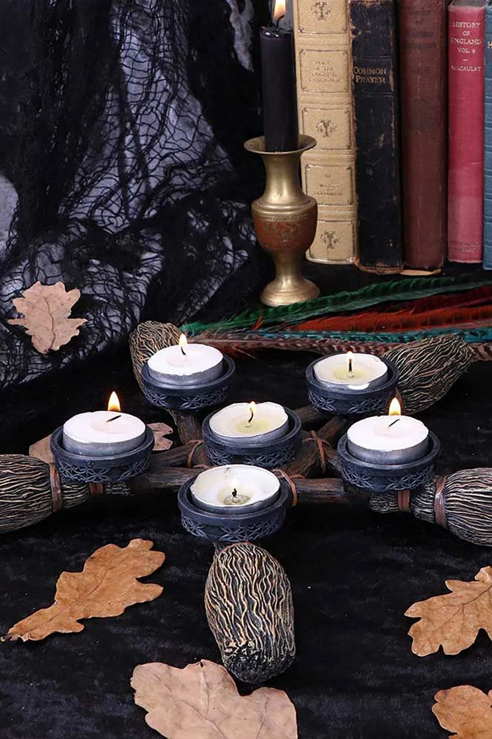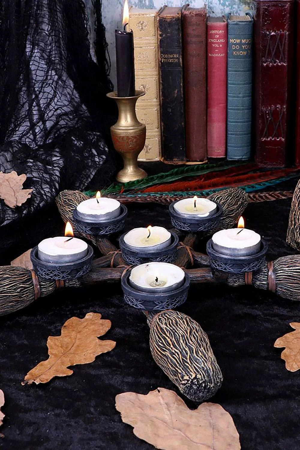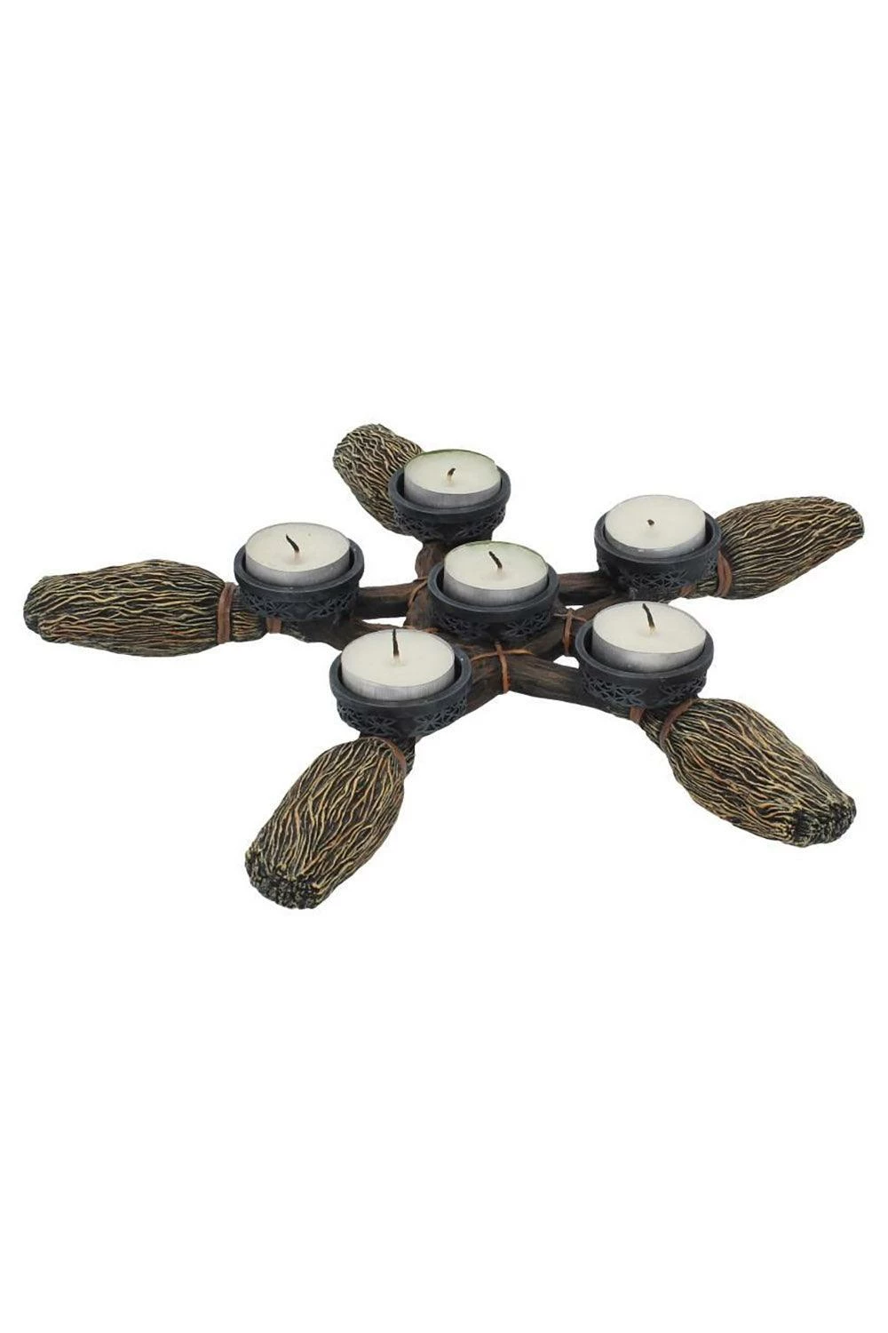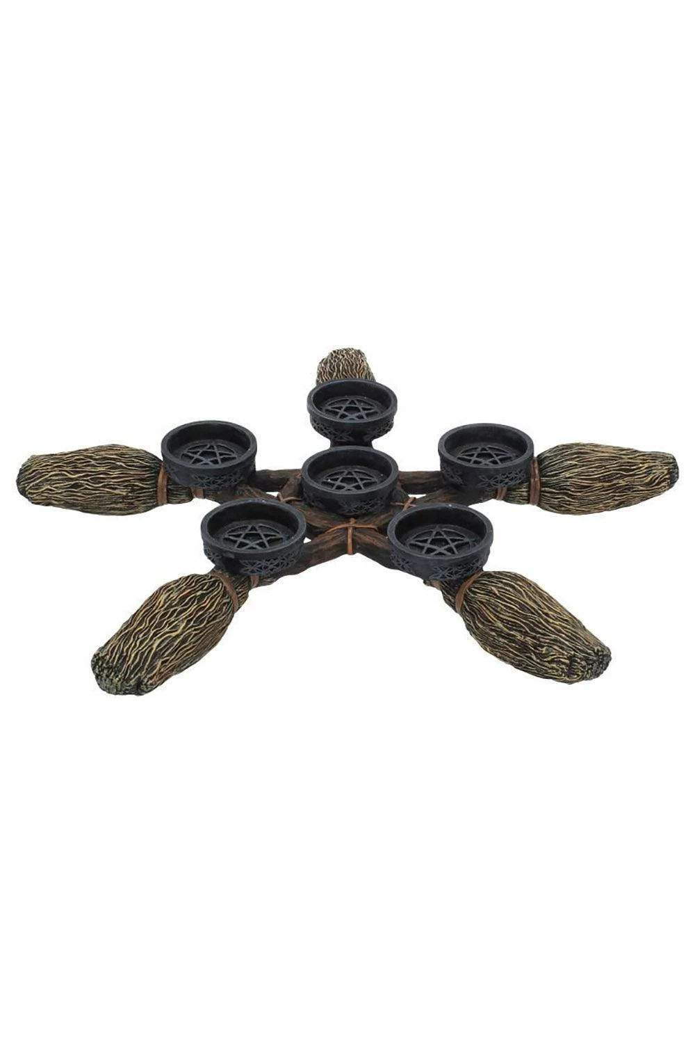 Invoke the spirits with this occult tea light candle holder, made for witches and warlocks! Cast in the finest resin, this mystical figurine features 5 broomsticks interlocked to form a pentagram. Complete your witchy rituals with the wiccan stands, designed to hold 6 candles. Painstakingly hand-painted and hexed to please your pagan heart.Â