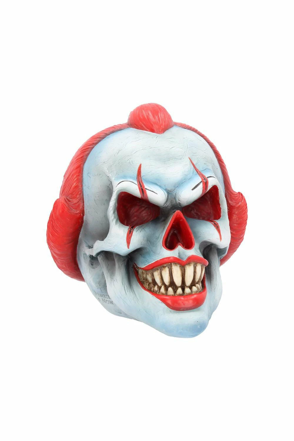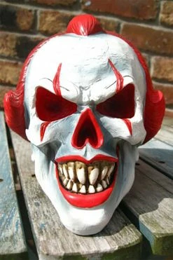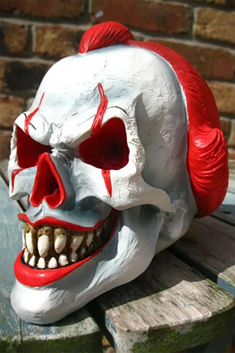 Bring the creepy circus into your crypt with this sinister clown statue! Painstakingly hand-painted, this horrifying figure features the skull of a clown, complete with ferocious fangs and blood-red clown makeup! Rest this statue on your shelf or curio cabinet to keep unwanted visitors away from your haunted home.Â