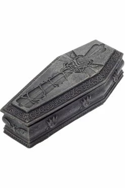 Let the dead protect your witchy wares in this creepy coffin stash box! A cross wrapped in thorns possesses the top of the box—gargoyles and ornate detailing haunt the sides. Constructed of high-quality resin, this coffin box is perfect for guarding your coins, jewelry, dark secrets, etc.Â