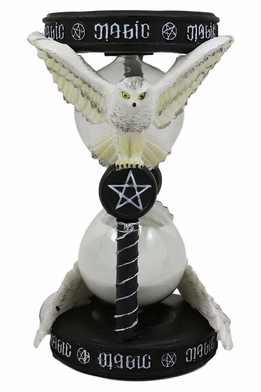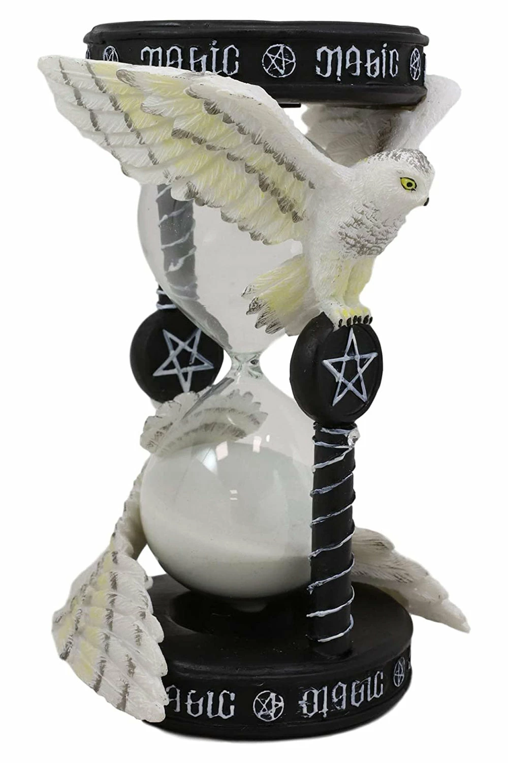 Awaken your sense of time with this beautifully bewitching sand timer! Exquisitely made, this occult sculpture features white owls perched along the glass orbs. Otherworldly symbols and magical lettering charms the columns and supernatural structure. Let the sands of time help you keep track of your reading and crafting time with the every-flowing sand grains cascading to the bottom of this haunting hourglass.Â