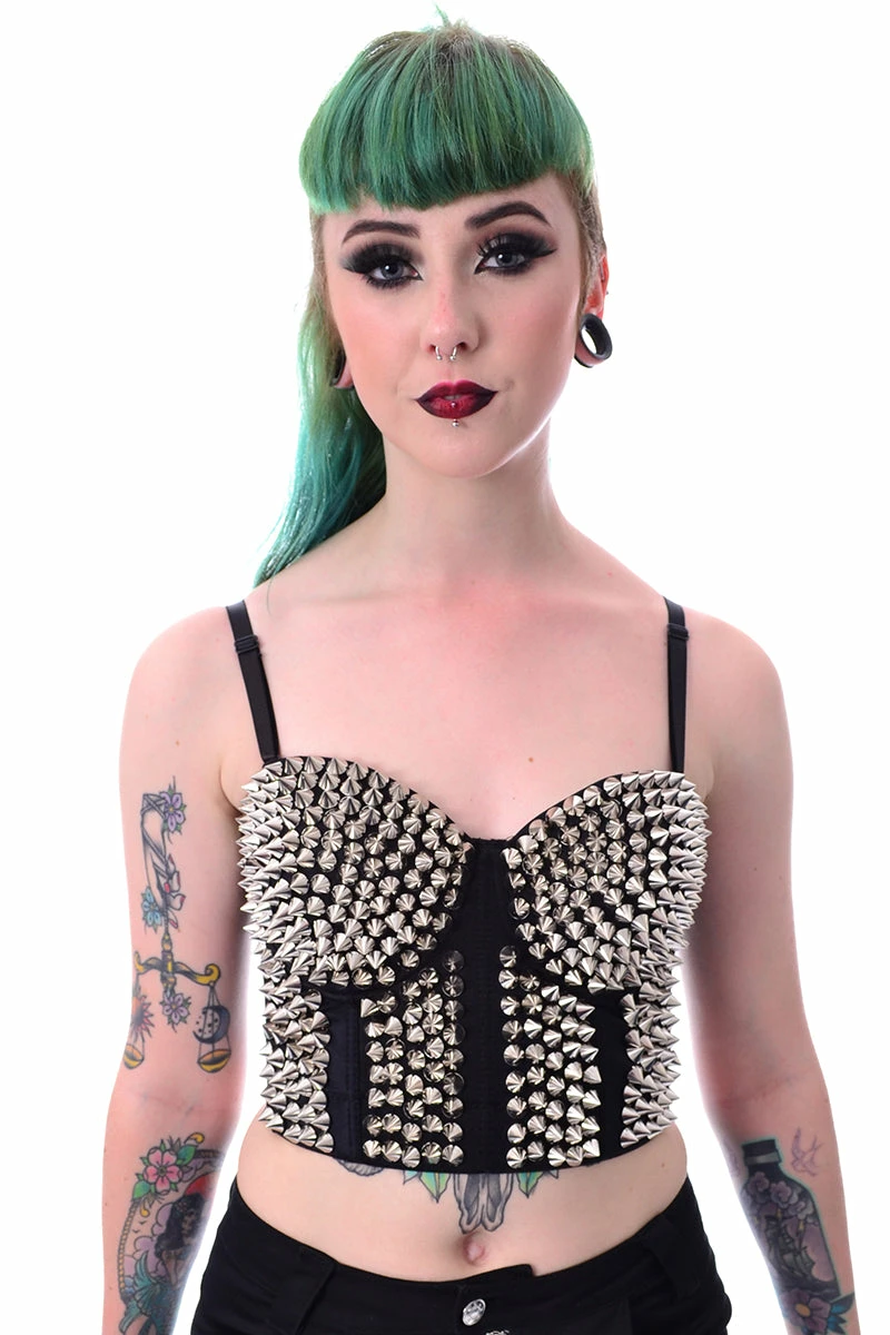 Embrace your inner baddie in this punk AF corset top! Own your inner evil in the all-over metal cone spike hardware. Finished with adjustable shoulder straps and wired support to keep you comfy when you head out to haunt. Pair this statement corset with skinny jeans and combat boots to add some kills to your heartbreak hit list.Â
