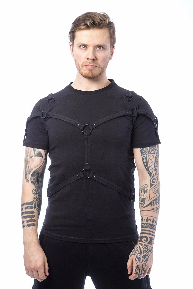 Slay in this black-as-night bondage shirt, hot n’ loaded with accent straps, o-ring hardware, and metal circle studs. Short sleeved and sexy to please your heathen heart. Constructed of a quality cotton blend to keep you comfy + creepy.Â