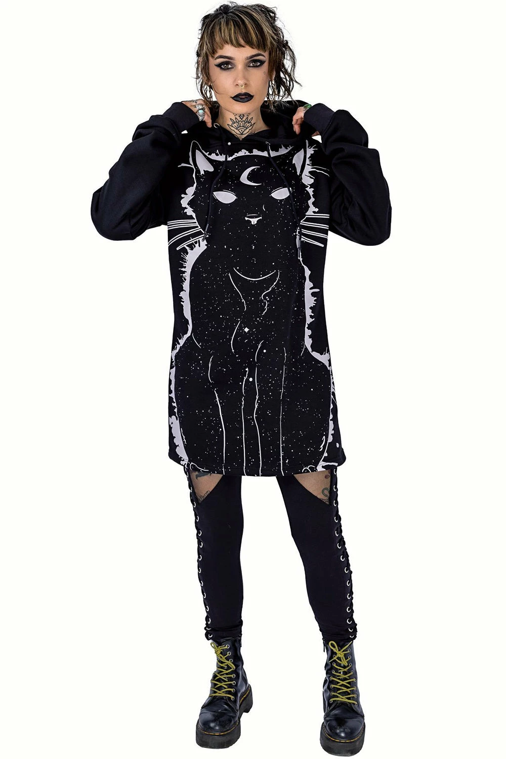 Conjure your inner cat in this witchy hoodie! Hex the moon in the mystical print, featuring a black cat enchanted with a crescent moon detail on her fiendish forehead. Twinkling stars and a celestial glow enchant her creepy kitty body. Keep it cozy in the oversized fit, thumbhole cutouts, and extra length for extra darkness.Â