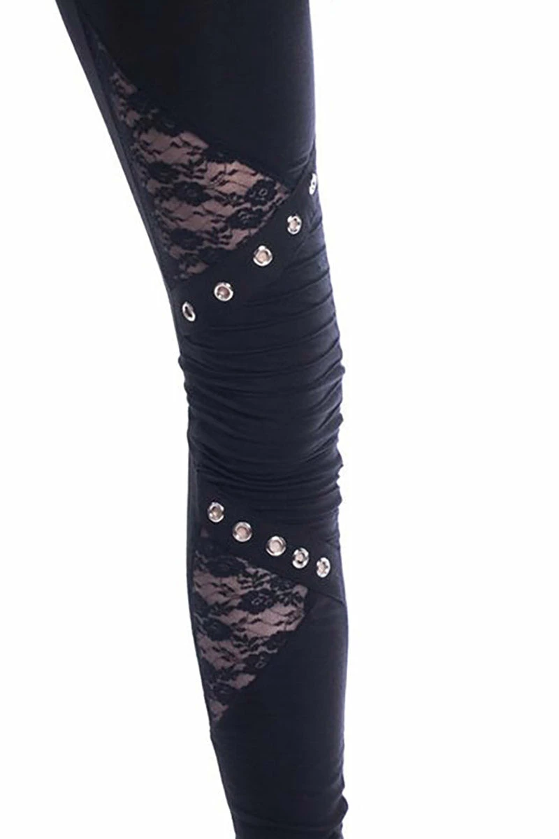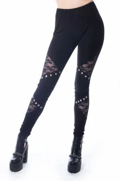 Wake ’em from their darkest dreams in these stunning leggings! Cut-out elements charm the soft black fabric, romanced by floral mesh and silver eyelets. Ribbed details hex the knees to edge out your alt aesthetic. High-waisted and stretchy for a comfy, flattering fit.Â