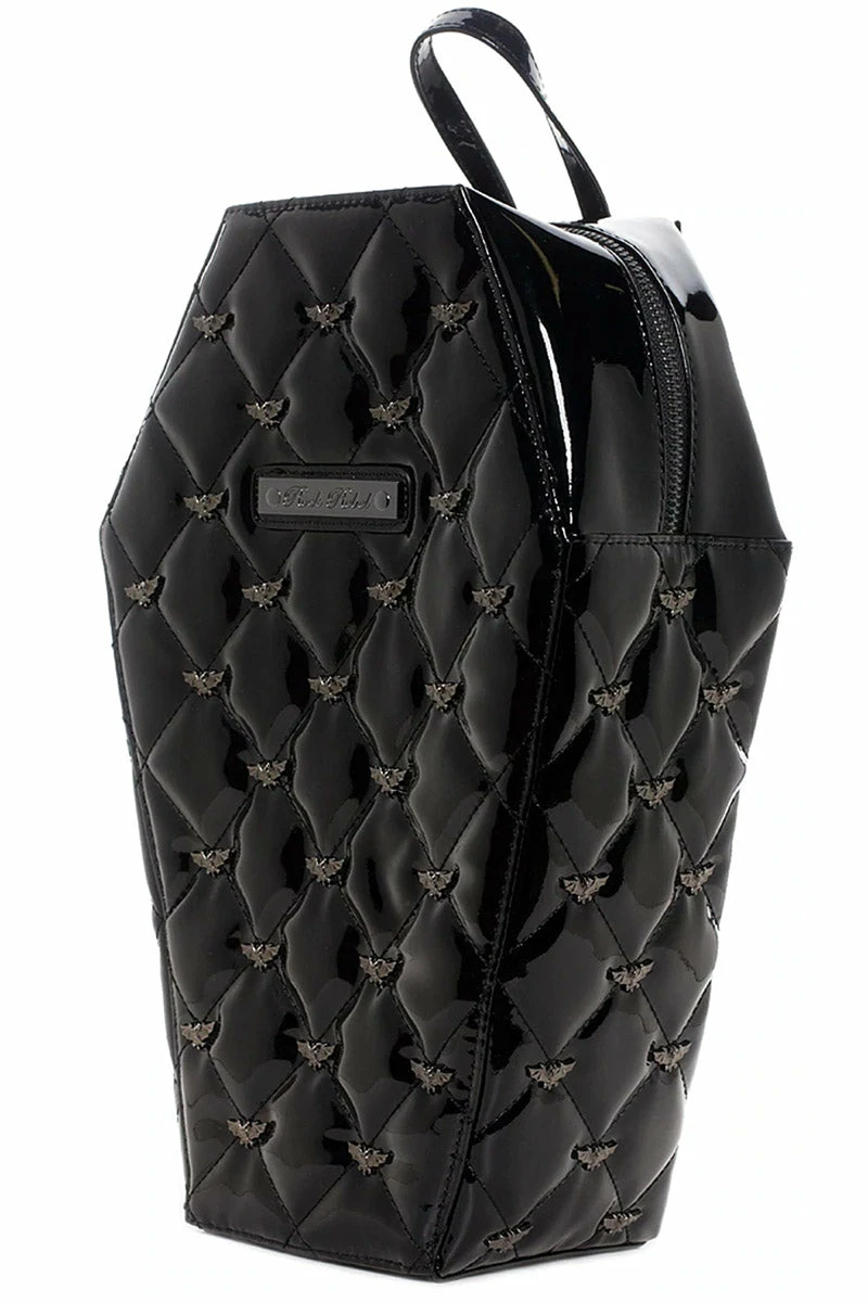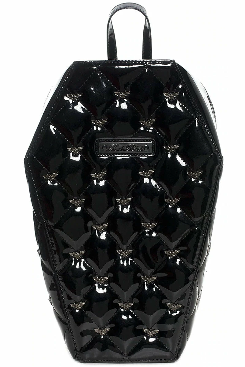 Carry your evil essentials in this drop-dead-darling coffin backpack! Made of quality vegan vinyl, this creepy coffin backpack is haunted all-over with a bewitching quilted pattern and silver bat studs. Keep your possessions safe in the main zippered compartment, inside pocket, and interior spiderweb lining. Complete with adjustable straps for the perfect living dead fit.Â