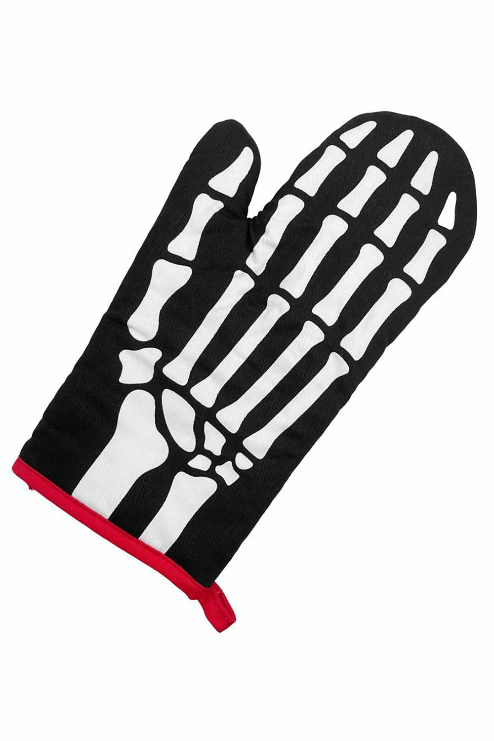 Protect your creepy cooking hands with these gothic oven mitts—perfect for haunting your hands and home! Constructed of quality cotton, this spooky oven mitt set features a ghostly-white skeleton hand design with blood-red trim. Complete with a hanging loop for easy storage!