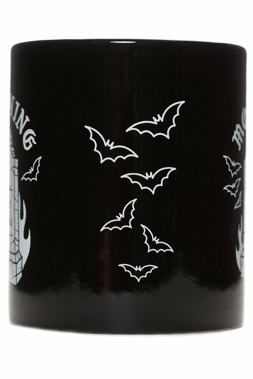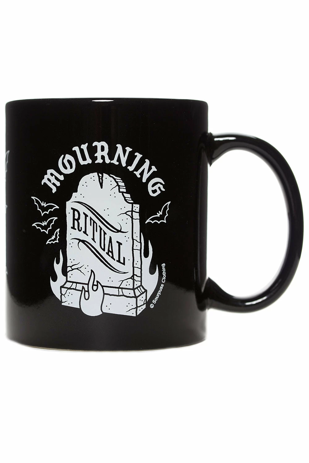 Start a new mourning ritual when you sip your favorite brew from this macabre mug! Constructed of quality ceramic, this creepy cup features a ghostly-white tombstone enraptured in hellish flames. A cauldron of bats flutters around the Mourning Ritual lettering for a splash of black humor. Graphics on BOTH sides for extra evil!