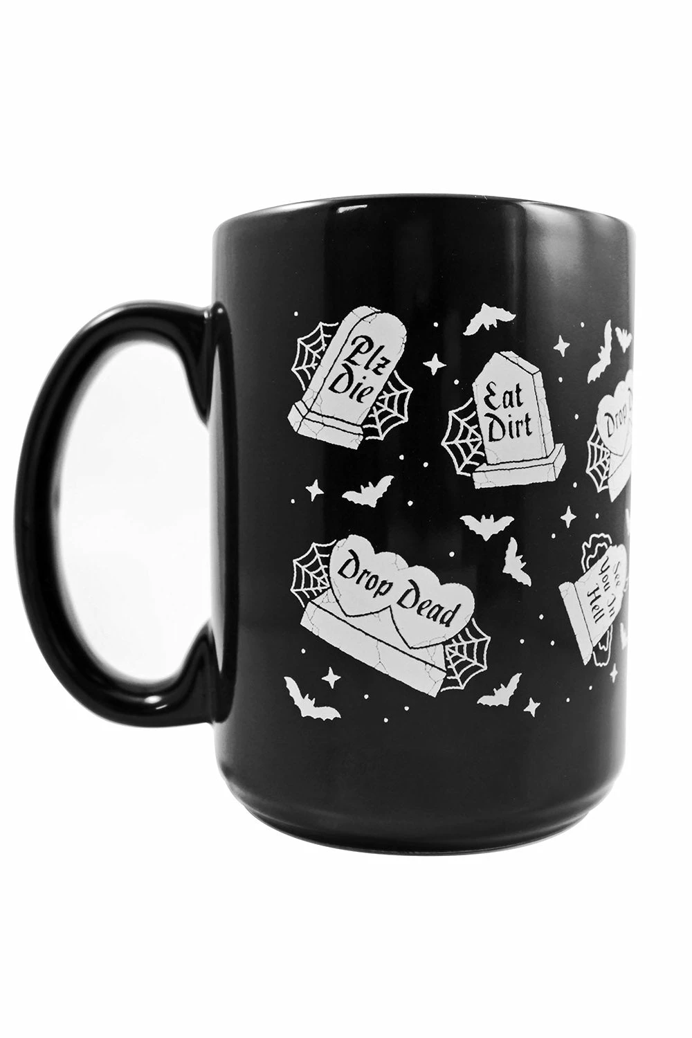 Stir some some black humor into your coffee with this hella hilarious mug! Made of premium ceramic, this gothic mug features an all-over print of ghostly headstones with not-so-nice messages. With a 15 oz capacity, this spooky mug is HUGE! Perfect for holding your tea, cider, coco, whiskey, whatevers.