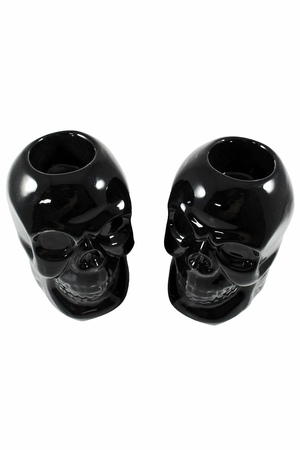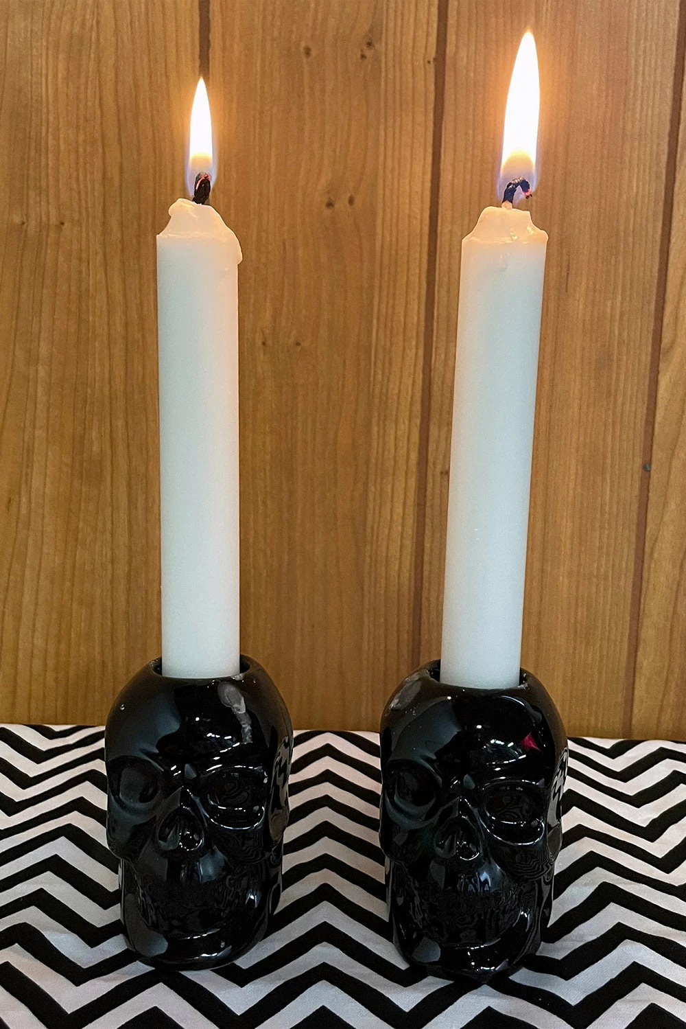 Creep out your candles with these sinister skull candlestick holders! Made of premium porcelain, this spooky set includes 2 macabre human skulls with holes on the tops of their skullcaps for holding taper candles! Complete with a glossy finish, these haunting candlestick holders are dying to darken your dinner table, bewitch your bedroom, or anywhere they are laid to rest.Â