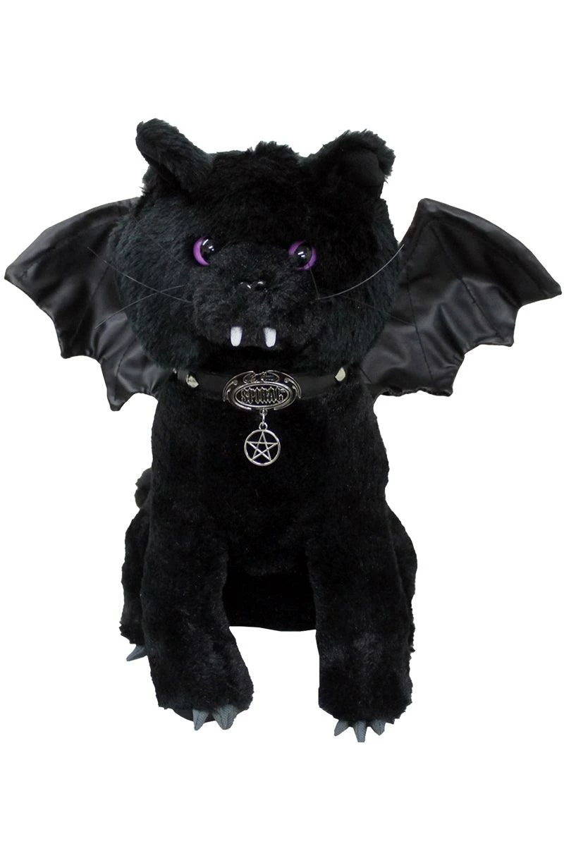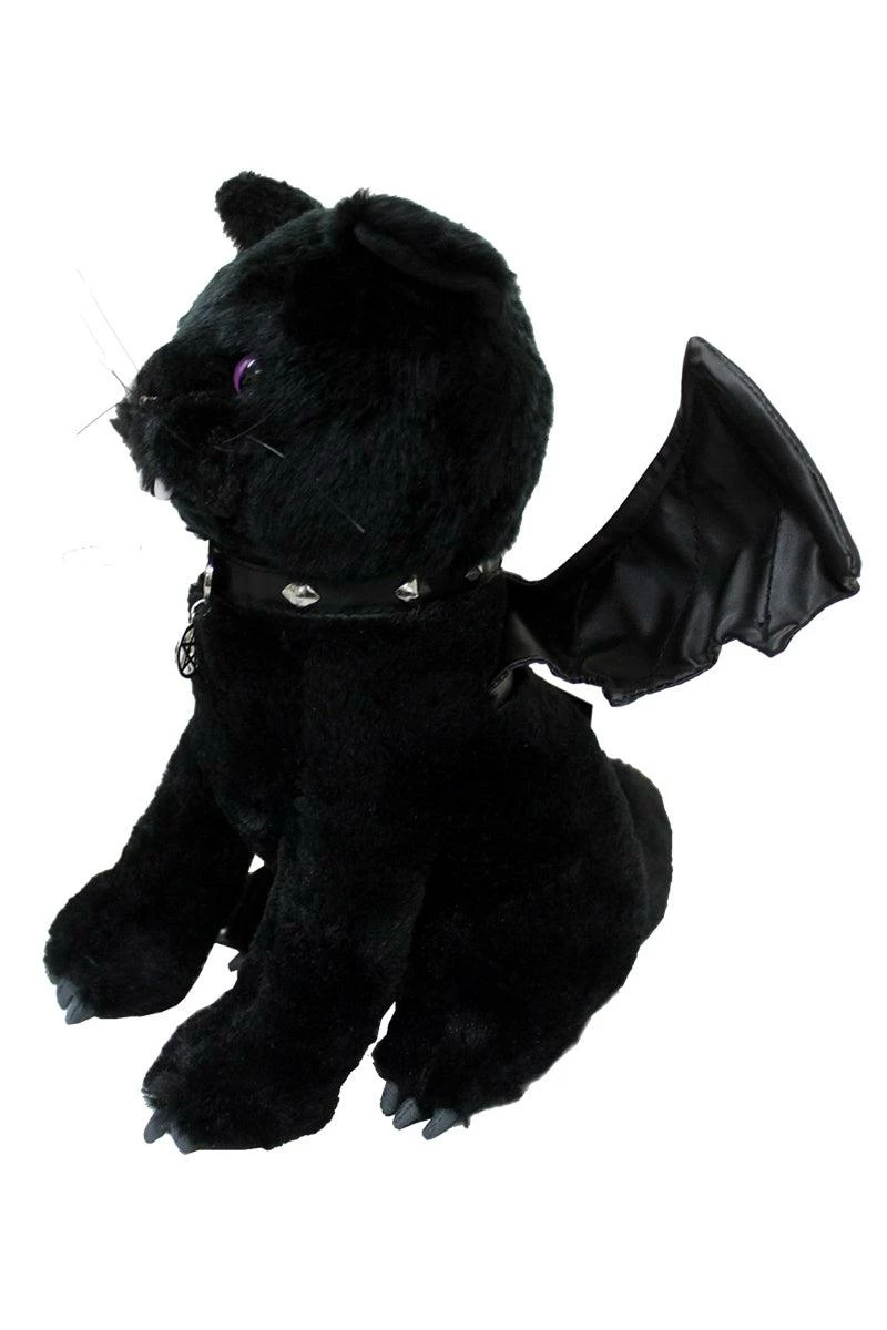 Behold Bat Cat… the mighty fur-midable plush! But fur-real, this batty cat is pawsitively adorable! A black cat with bat wings, this adorable plush features little feline fangs, a pentagram collar, heart-shaped nose, and purple eyes. Perch her on a throne of pillows, and Bat Cat will protect your bedroom from evil spirits and bat away bad vibes with her cute kitty-cat claws!