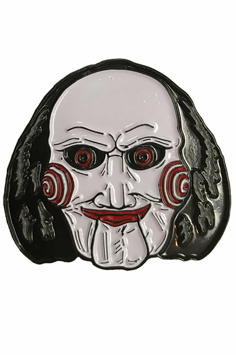 Add some horror and gore to your style with this signature Jigsaw pin! Hack and slash in spooky style with Billy the Puppet wearing his creepy clown makeup, spiral cheeks, and blood-red eyes. Pin this officially-licensed horror movie pin on your jacket or backpack to bring the dead wherever you go.Â
