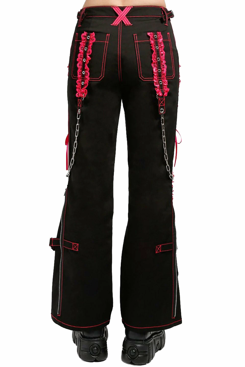 Catch glances and break hearts in these flared AF Tripp pants, designed to summon sexy spooks to your style. Corset details with hella hot pink ribbon lacing possess the sides of these gothic lolita pants—ruffle accents and contrast stitching haunt the flared fit. Finished with bondage straps, as baddie and beautiful as you.Â