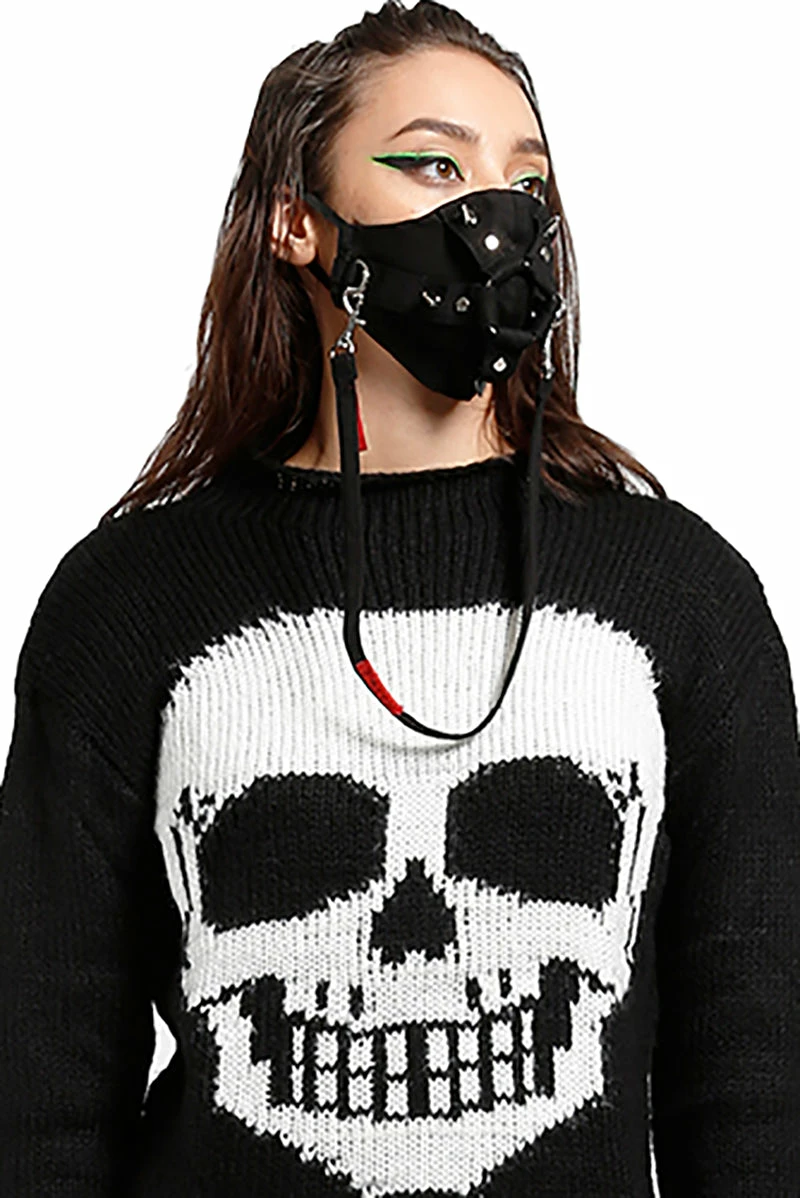 Harness the chaos of night in this epic face mask! Protect yourself in spooky style in the quality black cotton, made of the same material as Tripp pants! Features a center statement o-ring, metal eyelets, and silver spikes. Rock or detach the strap… perfect for resting around your neck when not in use.Â