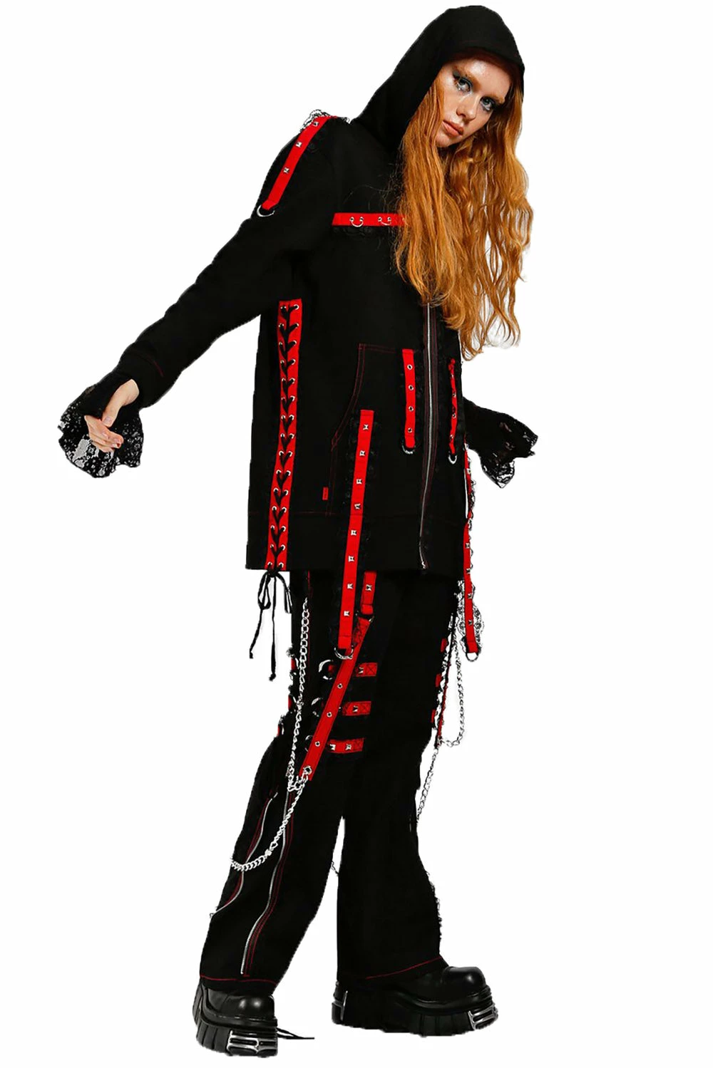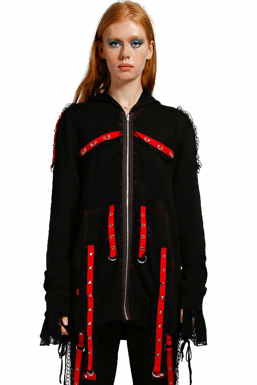 Awaken autumn in this hella cool Tripp jacket, loaded with details for days! Get cozy in the hood, front pockets, and thumbholes. Conjure gothic romance with the ruffled lace and blood-red accent strips. Lace up the corset sides for the perfect punk fit—grunge out in the metal pyramid studs, o-rings, and d-ring hardware! The perfect jacket for midnight promenades on fall eves.Â