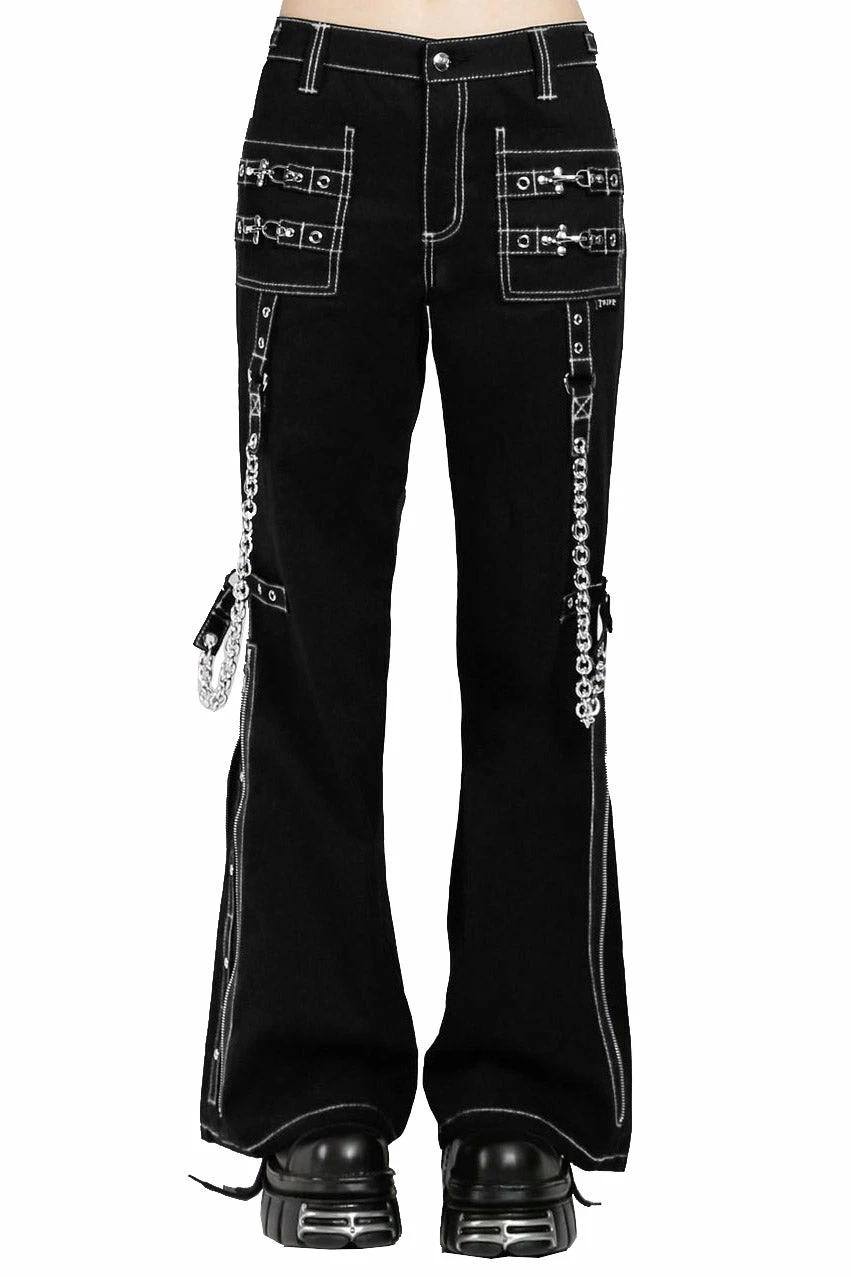 Grunge out in these Tumbler girls Tripp pants, black with bone-white contrast stitching! The night is yours in the baddie bondage straps, silver chains, and pyramid studs. Customize your afterlife with the adjustable pant legs—zip ’em up or down for a change in fit!Â