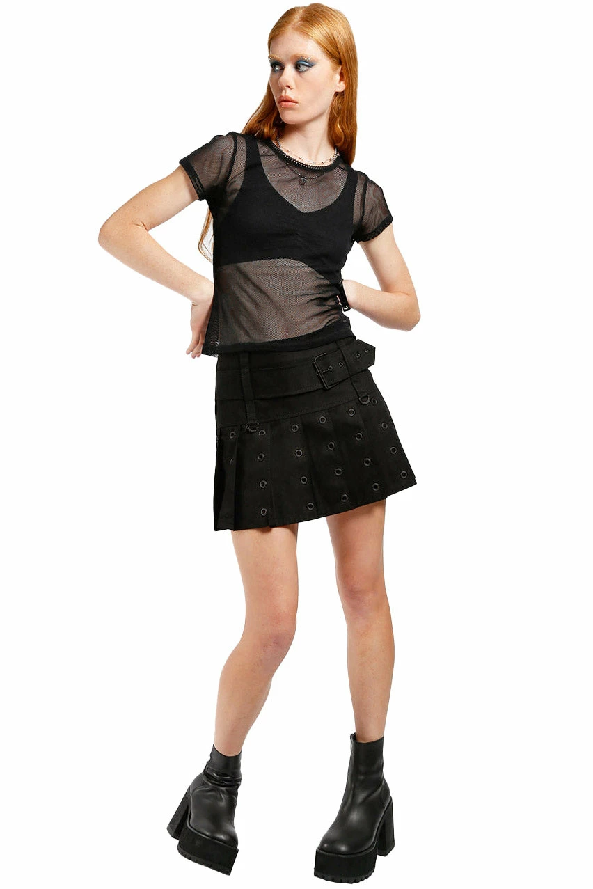 Haunt the day and hex the night in this stunning Tripp skirt! Get legs for days in the high-waisted cut and pleated fit, designed to flatter your figure and elongate your legs. Embrace your inner rage in the black metal hardware, finished with an adjustable matching belt. A must-have for a baby bat’s creepy closet.Â