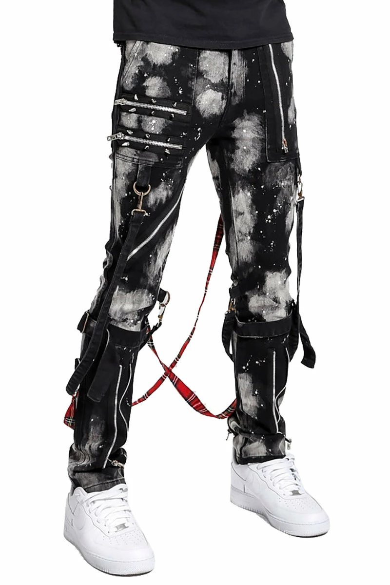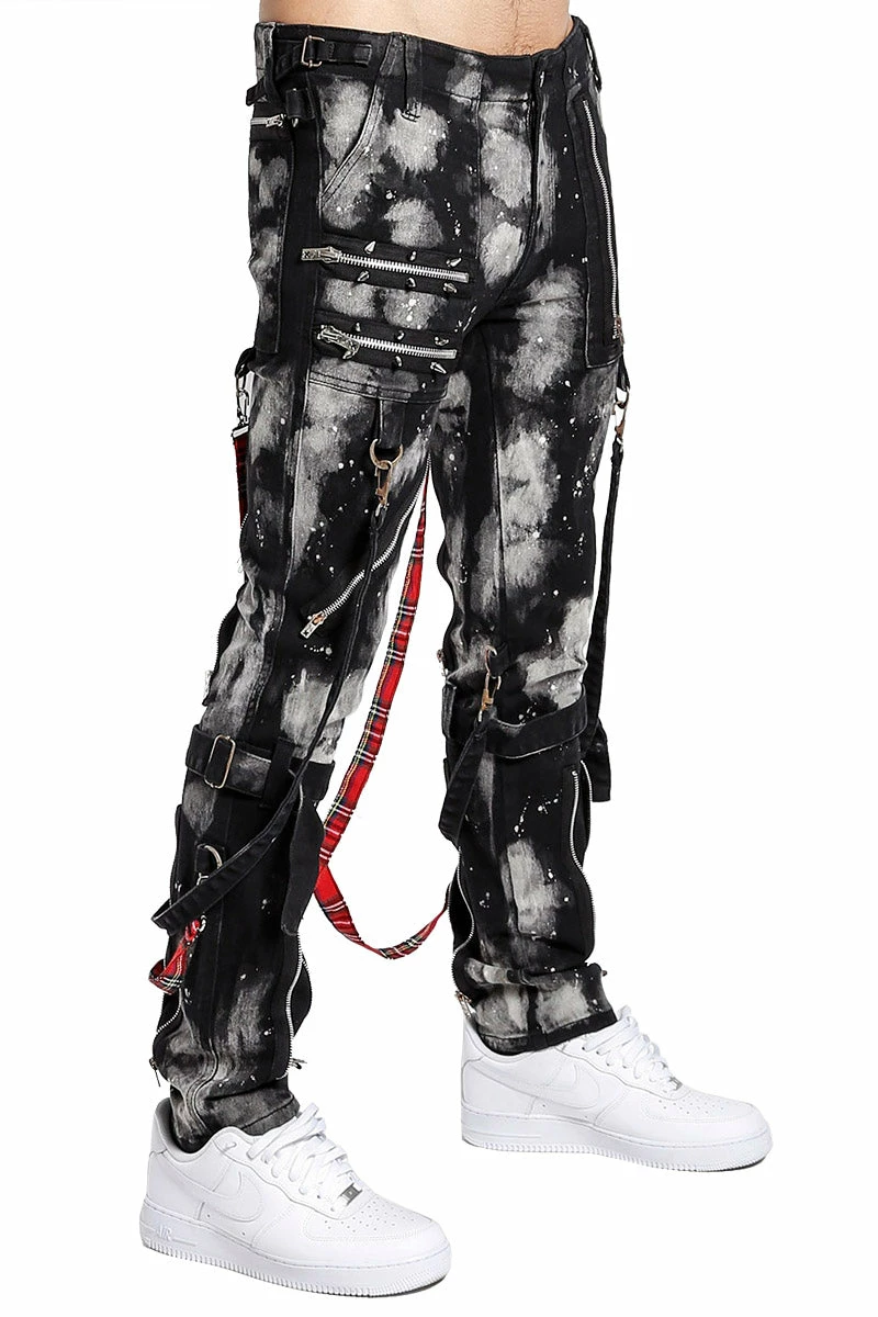 Distress your grunge aesthetic in these bleached bondage pants! Kill the night in the all-over bleach detailing, haunted with removable red plaid bondage straps. Features silver spike hardware, pockets, and exposed zipper accents. Finished with adjustable legs when you want a change in fit!