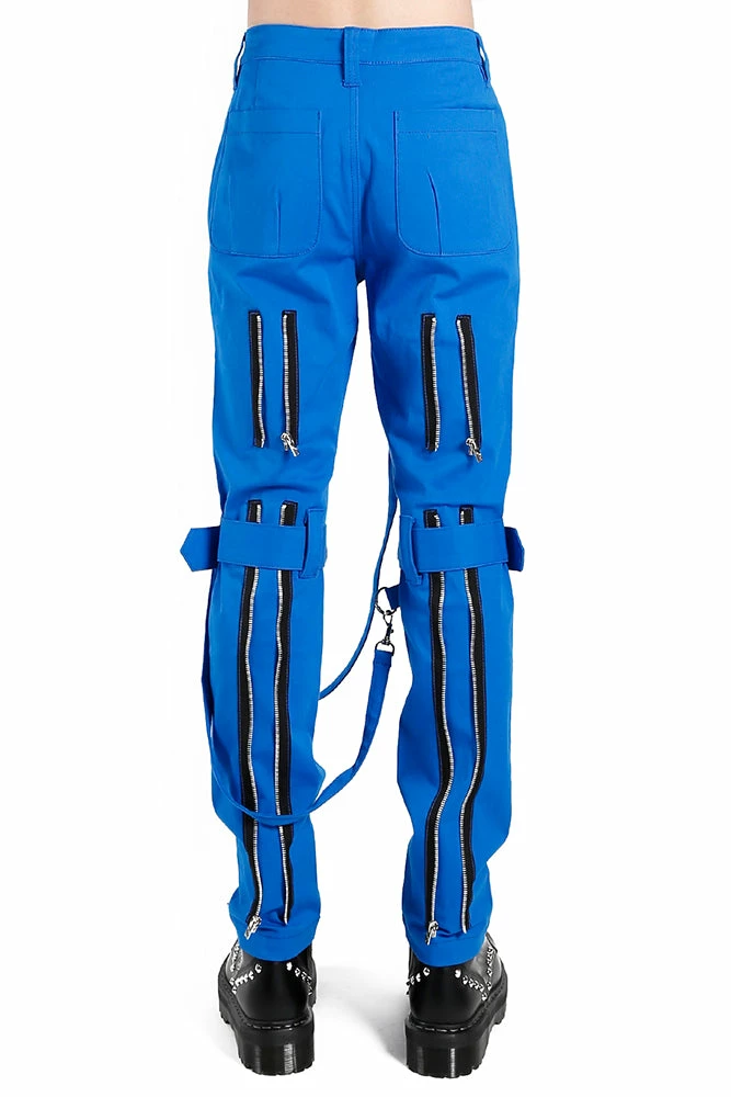 Be the one they won’t forget in these one-of-a-kind Tripp pants. Constructed of bright blue fabric, these punk pants bring the extreme with the contrast strips, D-ring hardware, and zipper details. Zip up the pant legs for a change in fit—remove the bondage straps for a lax look.Â