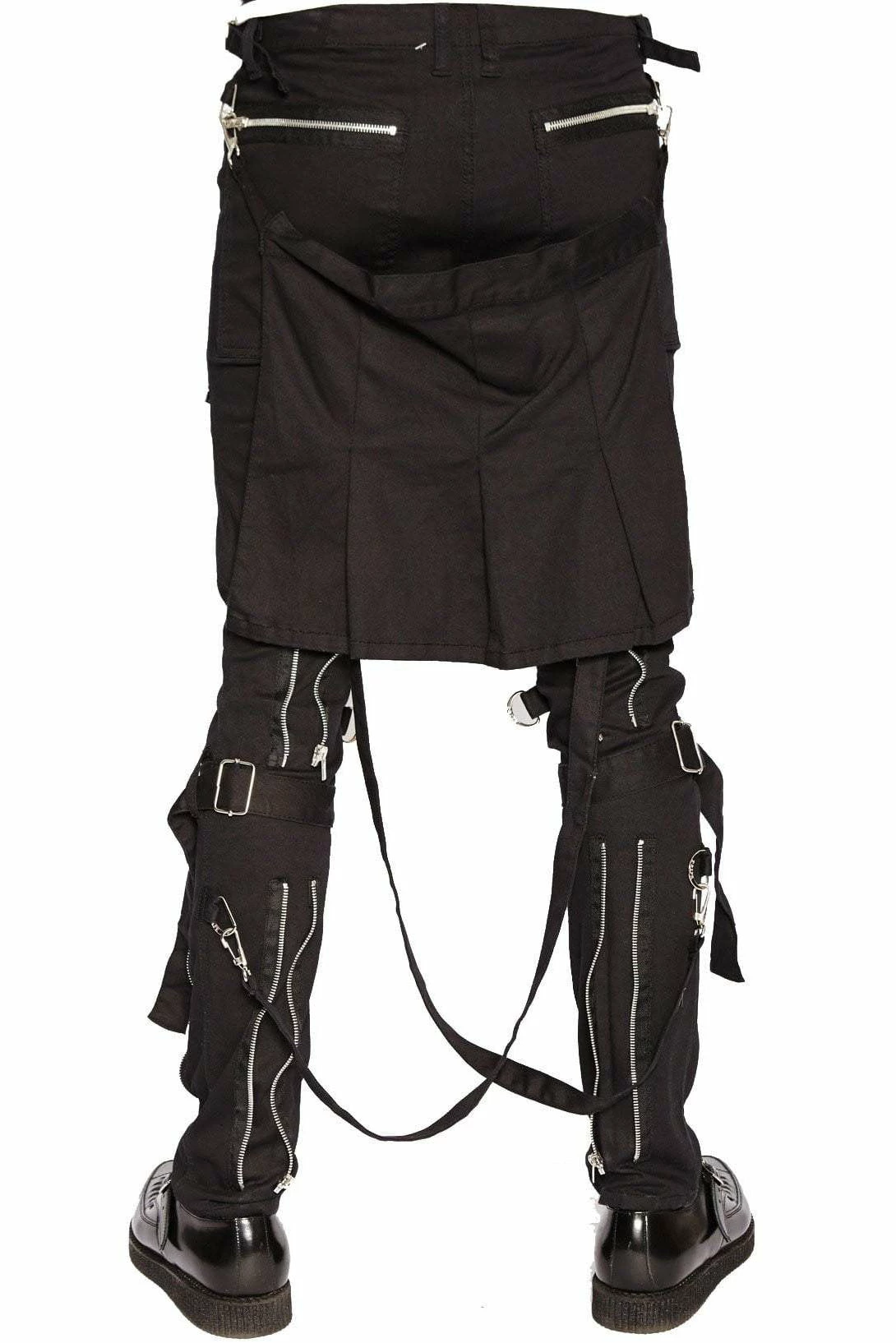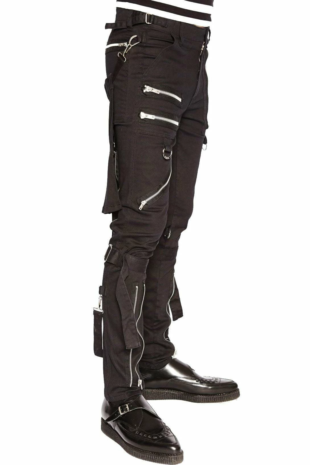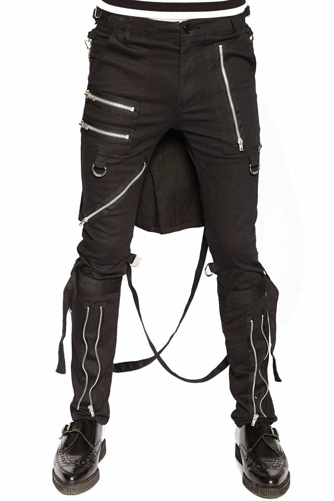These black skinny jeans feature exposed zippers all over, bondage straps, D-ring details, and a back bumflap for extra drama. Zip up the pant legs for a change in fit—remove the bondage straps for a lax look. Made of high-quality cotton, these slim pants are constructed to keep you comfy & cool all the dangerous dayz of yer life.